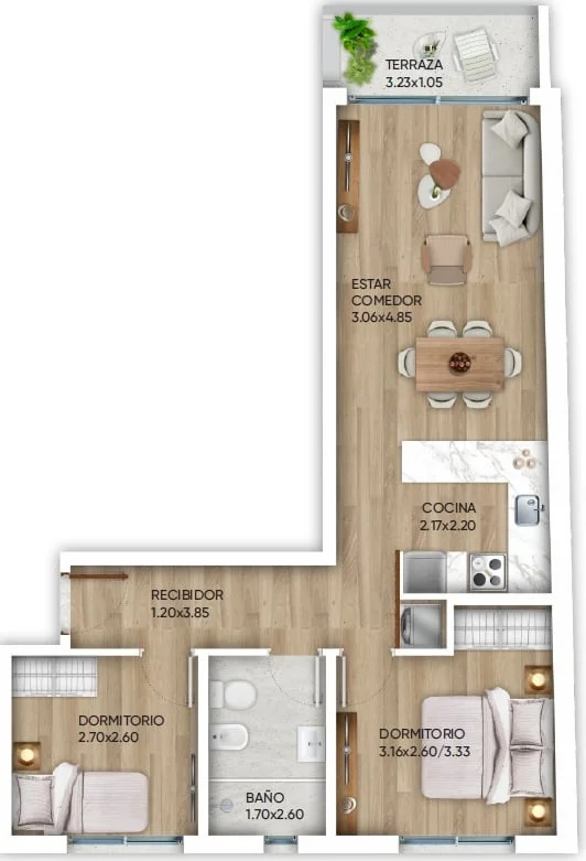 Noveno piso al contrafrente con orientación Norte. Living comedor con cocina semi integrada, con salida a la terraza.
