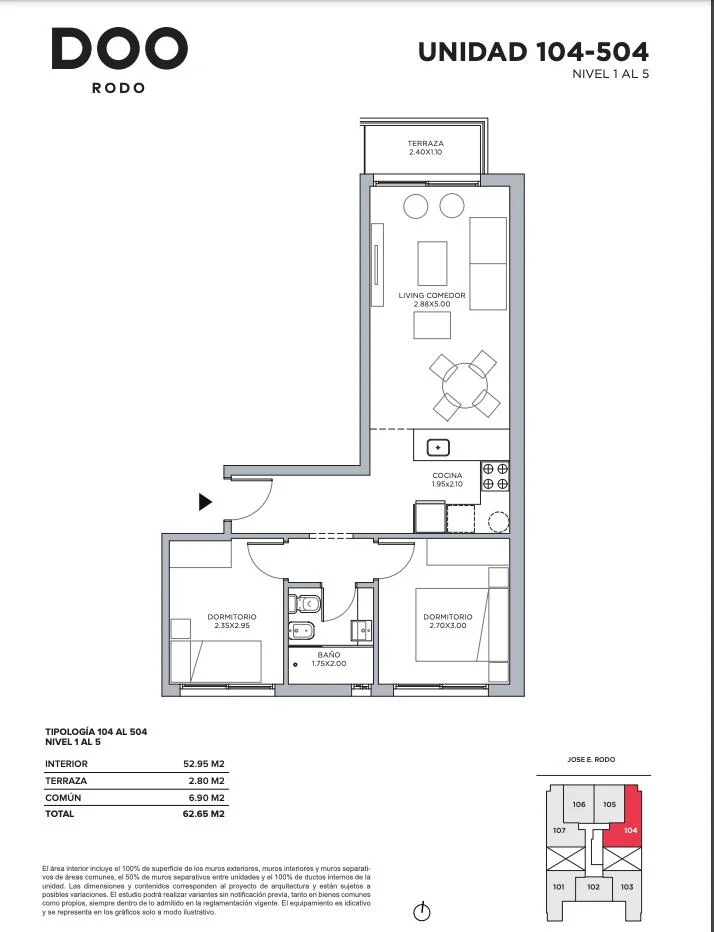 Al frente con orientación Norte, living comedor con cocina integrada. Salida al balcón. Dormitorios al contrafrente.