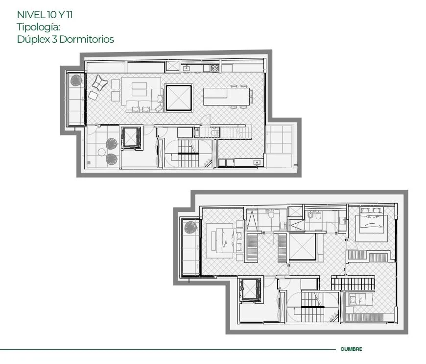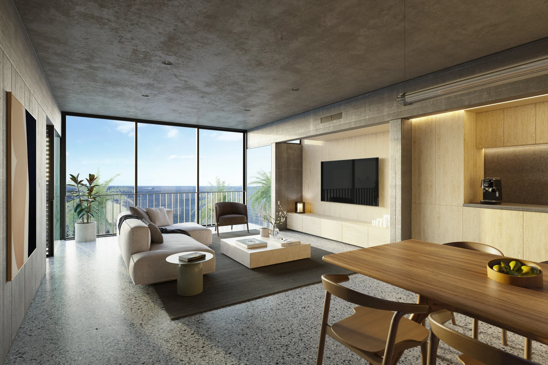 El edificio se diseñó con una volumetría innovadora, creando un tragaluz central que conecta y equilibra las áreas privadas y públicas de cada apartamento. Este detalle arquitectónico no solo realza la estética del espacio sino que también maximiza la entrada de luz natural, creando un ambiente más luminoso y acogedor en todo el hogar.