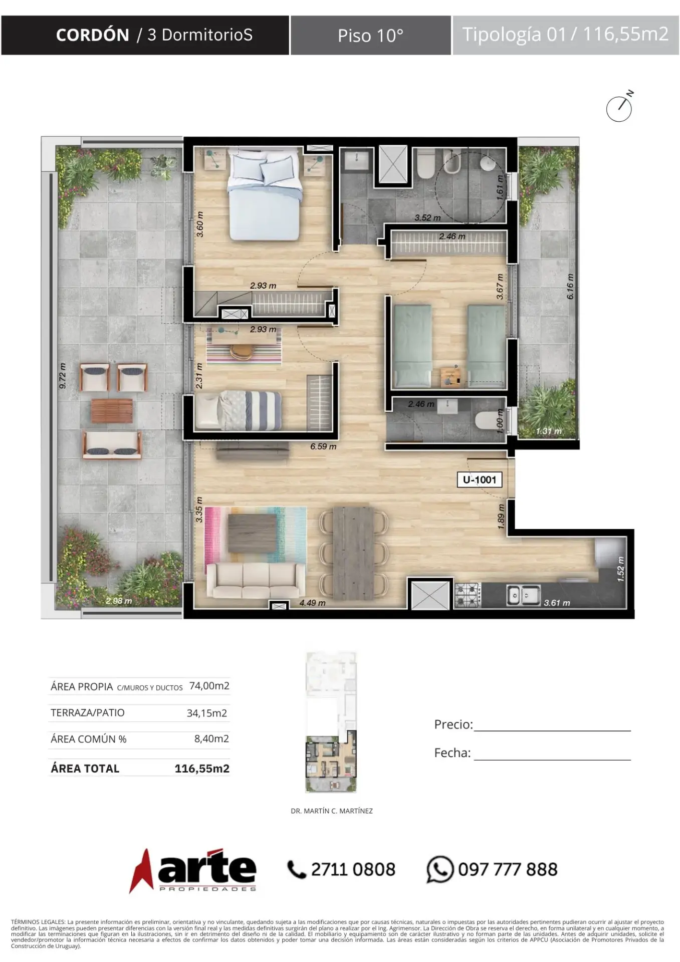 Venta de apartamento de 3 dormitorios pent-house con 2 terrazas en Cordón muy próximo a la plaza Liber Seregni y centro comercial/terminal de buses tres cruces Estrena mediados 2027 Edificio amparado bajo la ley de vivienda promovida 18.795 con exoneración de impuestos tributarios -Todos los ambientes con salida directa a terraza -3 dormitorios, 2 baños y 2 terrazas -Amplio living comedor con más de 3m de ancho -Portero eléctrico en hall y visores con cámara en cada unidad -Previsión para aire acondicionado -Pisos de vinílico símil madera y porcelanato -Aberturas con cortinas de enrollar en dormitorios AMENITIES: Salón de usos múltiples, terraza amplia, parrillero común de buenas dimensiones Garajes disponibles, consultar disponibilidad (no incluidos en el precio) Consulte por asesoramiento profesional!
