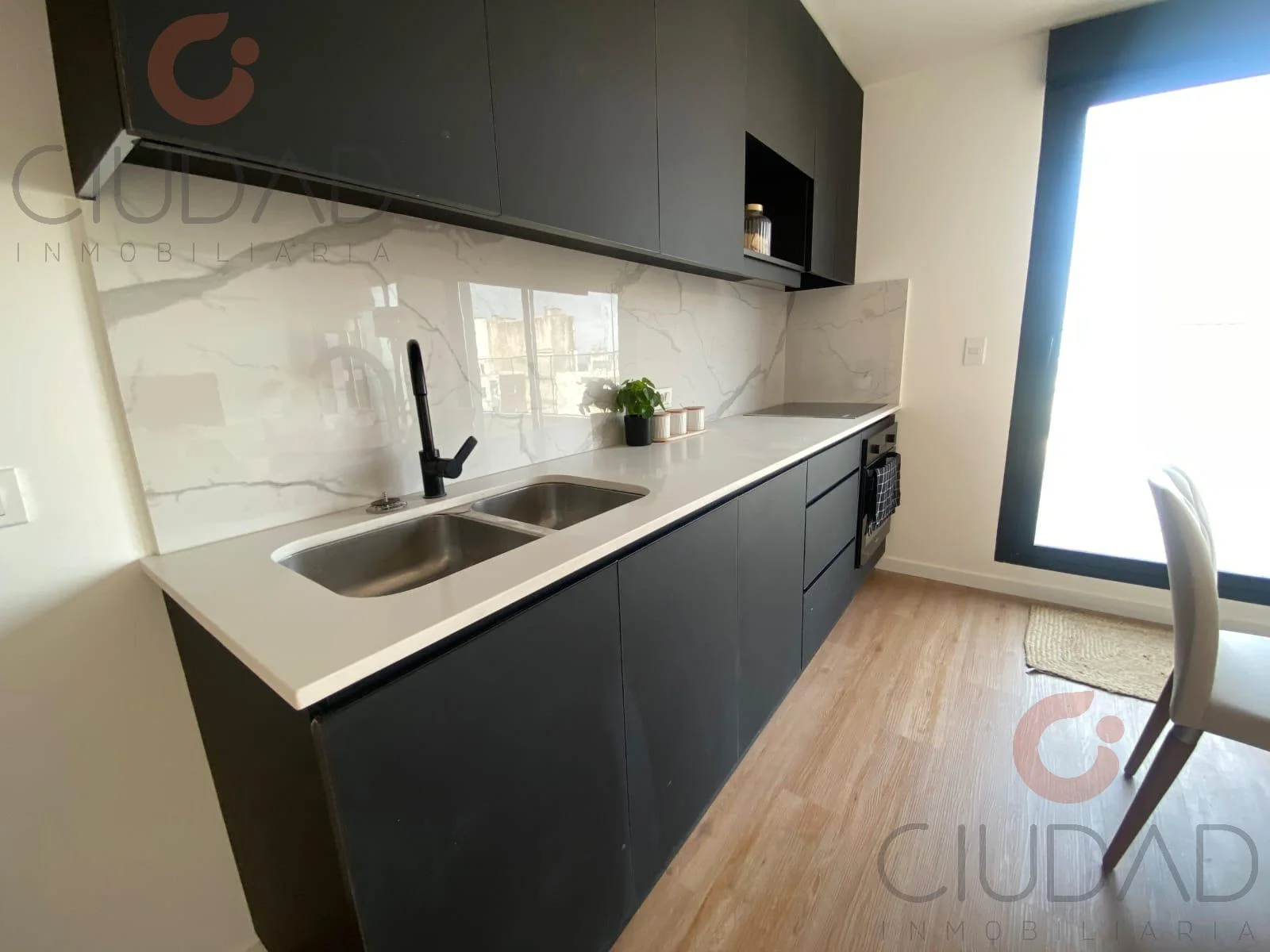 - Cocina de concepto abierto equipada con horno, anafe y campana