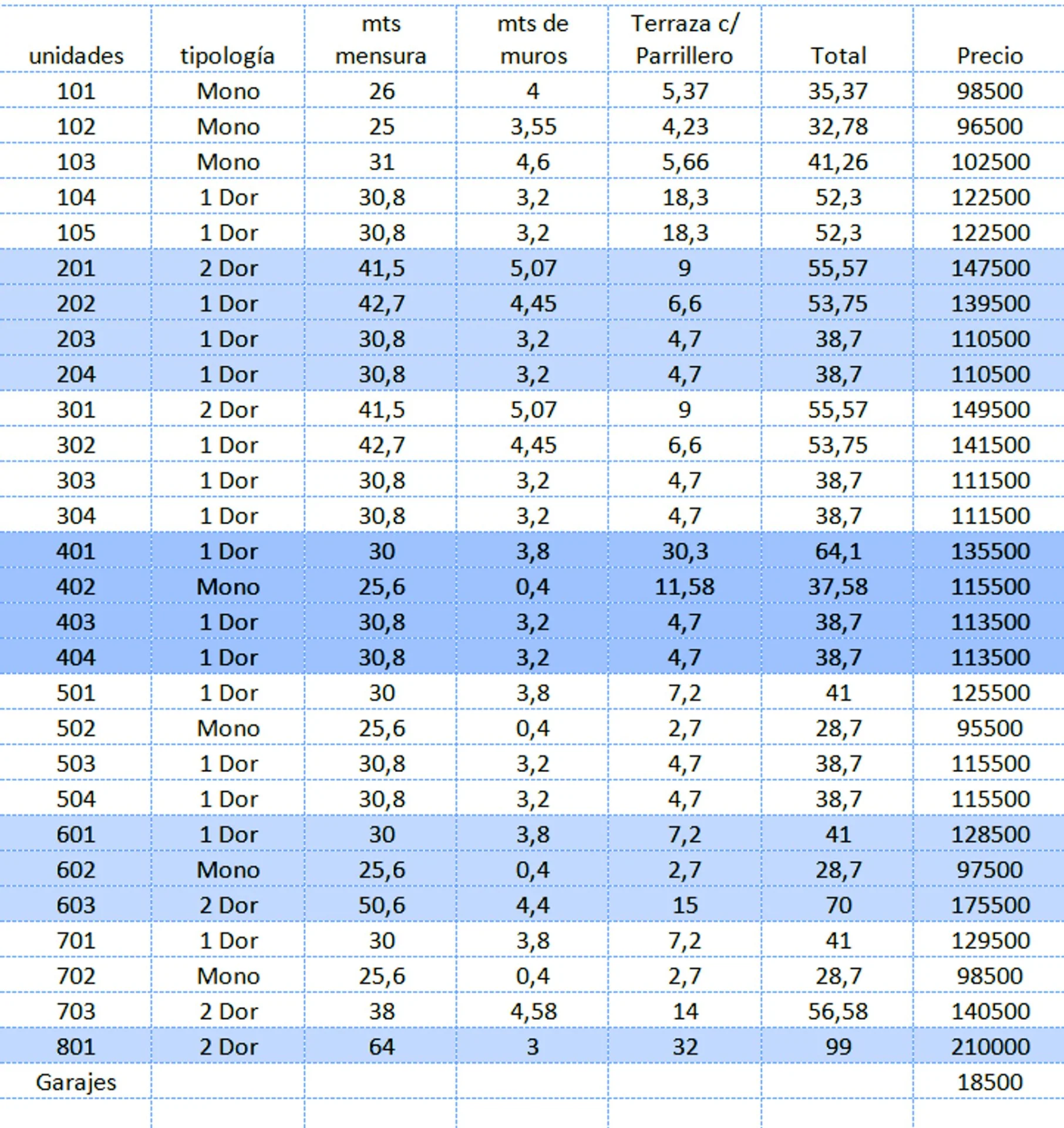 Corredor Responsable: - Contacto: Daniel Blanco Conjunto de 28 unidades en propiedad horizontal completamente a estrenar, son 17 unidades de 1 dormitorios, 4 unidades de 2 dormitorio, 7 monoambientes. Todas las unidades cuentan con amplias terrazas con parrilleros de uso exclusivo, y con su sector de lavadero individual dentro de cada unidad. El edificio cuenta con la opción de adquirir garaje. Excelente ubicación. El precio de publicación corresponde a un monoambiente de 98500 dólares más 3% gastos de ocupación, 3% + IVA gastos inmobiliarios, más gastos notariales. Consulte por otras opciones! Cada Oficina es de propiedad, gestión y desarrollo independiente La presente publicación describe las características esenciales del inmueble, debiéndose consultar al responsable de la operación por la eventual actualización de las medidas, descripciones arquitectónicas y funcionales, servicios, impuestos, precios y demás información, cuyos valores son aproximados.