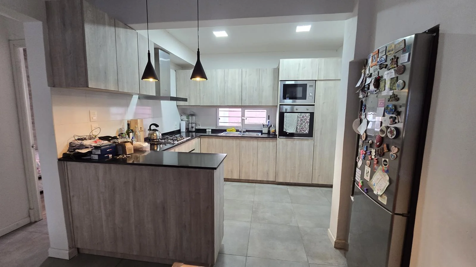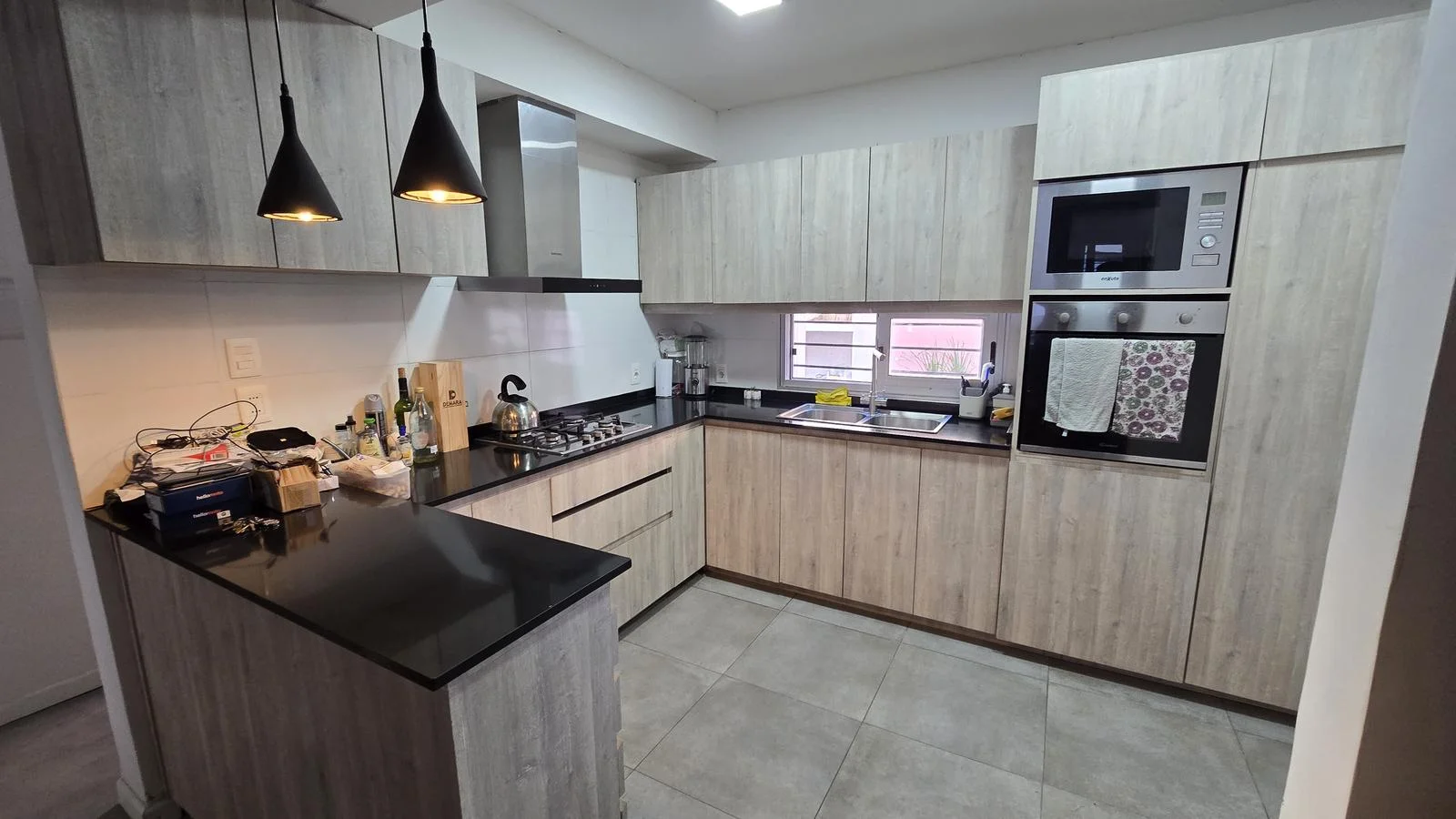 - Gran living comedor, más cocina semi integrada, con mesada tipo barra, muebles aéreos y bajo mesada, campana extractora, encimera de 4 hornallas (gas), horno y microondas empotrados.