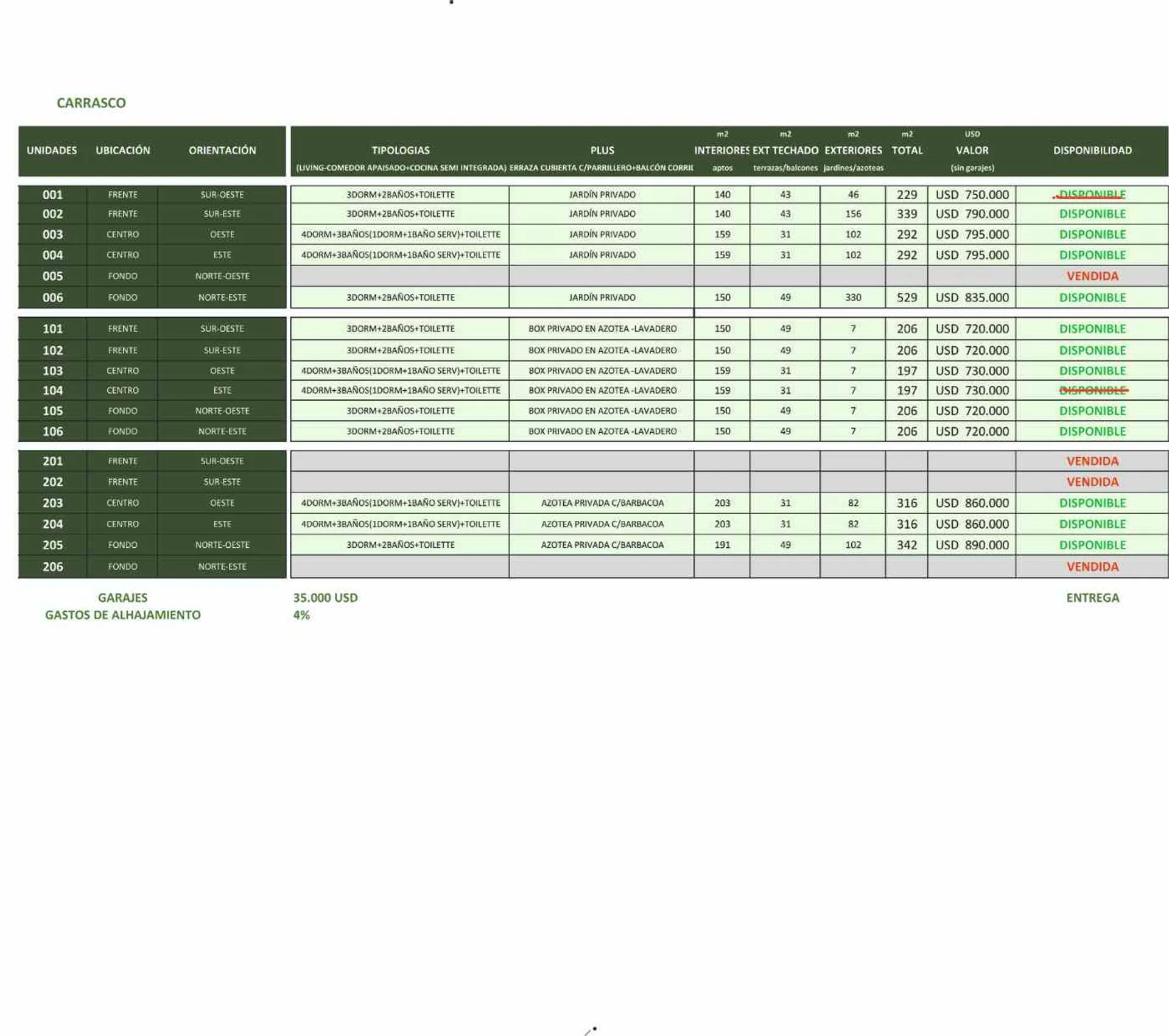 Corredor Responsable: - Contacto: Mitsuko Kurioka VENTA DE APARTAMENTOS EXCLUSIVOS DE 3 y 4 DORMITORIOS EN PROYECTO RESIDENCIAL UBICADO EN CARRASCO SUR, MONTEVIDEO. Se destaca por su diseño arquitectónico de alta calidad, elegante y contemporáneo, ofreciendo espacios cómodos, bien iluminados en un entorno privilegiado. Cada espacio incorpora expansiones exteriores como jardines, balcones y terrazas que permiten disfrutar plenamente del aire libre. Los apartamentos de planta aja cuentan con jardines privados, proporcionando un espacio exterior exclusivo. Las unidades de pisos superiores disponen de amplios balcones con parrilleros, ideales para disfrutar al aire libre, mientras que los apartamentos del ultimo nivel (segundo) son tipo dúplex, con acceso a terraza de uso exclusivo que ofrece vistas inigualables y un espacio adicional para esparcimiento. Cada unidad cuenta con 2 garages en el subsuelo, brindando mayor comodidad a los residentes. SUBSUELO: Cuenta con 38 cocheras con bauleras y 2 cocheras para discapacitados. Además de bicicletero y laundry. PLANTA BAJA: 6 unidades con jardín propio. rampa de acceso al subsuelo, con hall de acceso al edificio con intervenciones de paisajismo. PRIMER PISO: 6 unidades (4 de 3 dormitorios y 2 de 4 dormitorios) con balcones aterrazados con parrillero. SEGUNDO PISO: 6 apartamentos (4 de 3 dormitorios y 2 de 4 dormitorios) con acceso a parrillero y expansión de uso propio de azotea PATIO CENTRAL: Es el núcleo del edificio, un espacio abierto que fusiona naturaleza y arquitectura en perfecta armonía, donde combina la vegetación con materiales nobles como la madera y el hormigón. FECHA ESTIMADA ENTREGA JUNIO 2027 CONSTRUCCION TRADICIONAL con bloque de hormigón celular y ticholos. Materiales de primera categoría. INCLUYE: Estufa de combustión cerrada y calefacción radiante en piso por bomba de calor. COCINA: anafe, horno y extractor ABERTURAS: todas DVH (doble vidrio hermético) GARAGES: 35.000 usd (No incluido en el precio) GASTOS COMUNES APROX: 20.000$ GASTOS DE CONEXION: 5% LISTA PRECIOS Y DISPONIBILIDAD EN ULTIMA FOTO Cada Oficina es de propiedad, gestión y desarrollo independiente La presente publicación describe las características esenciales del inmueble, debiéndose consultar al responsable de la operación por la eventual actualización de las medidas, descripciones arquitectónicas y funcionales, servicios, impuestos, precios y demás información, cuyos valores son aproximados.