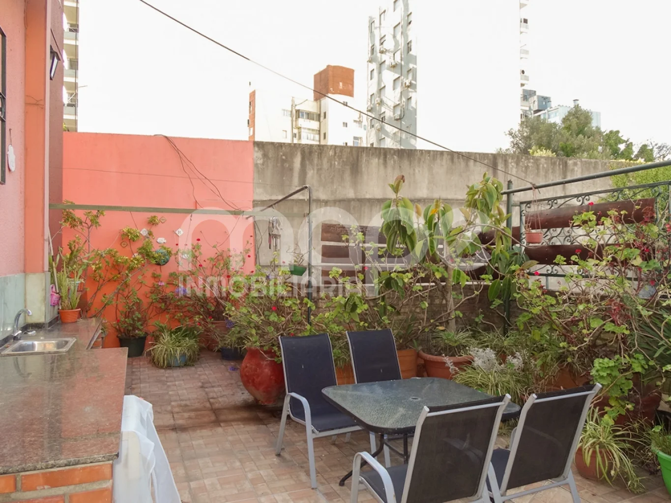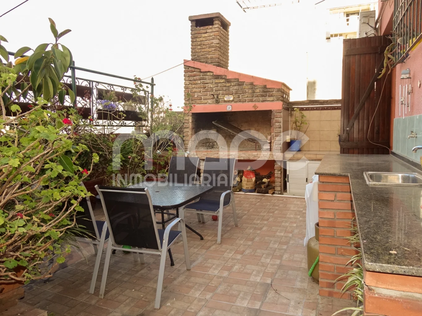 - Amplio patio con vegetación, parrillero y mesada de granito con lavamanos.