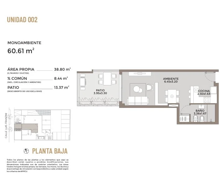 La unidad se ubica en planta baja al frente con orientación Oeste. Una planta cómoda y funcional, terminaciones de categoría. Living comedor con cocina semi integrada con salida al patio.