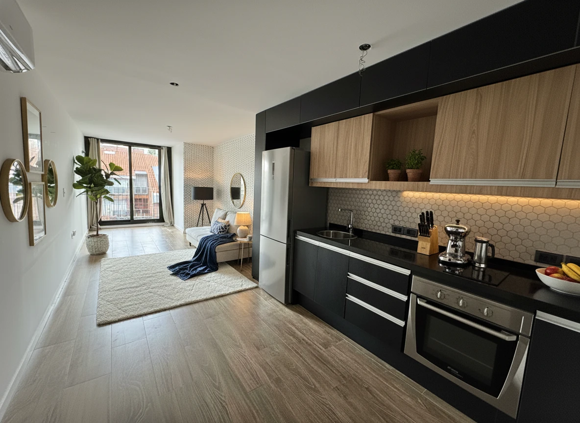 Cocina integrada al ambiente principal, muy completa con placares bajo y sobre mesada.