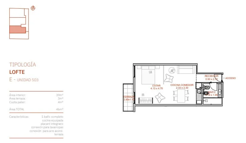 La unidad se encuentra en el quinto piso al contrafrente con orientación Oeste. Planta funcional con terraza. 1 baño.