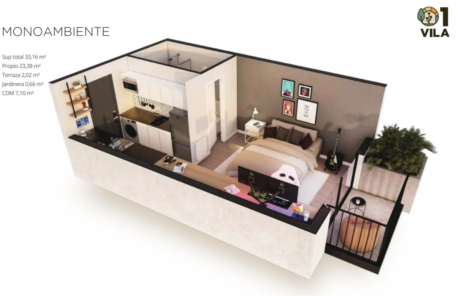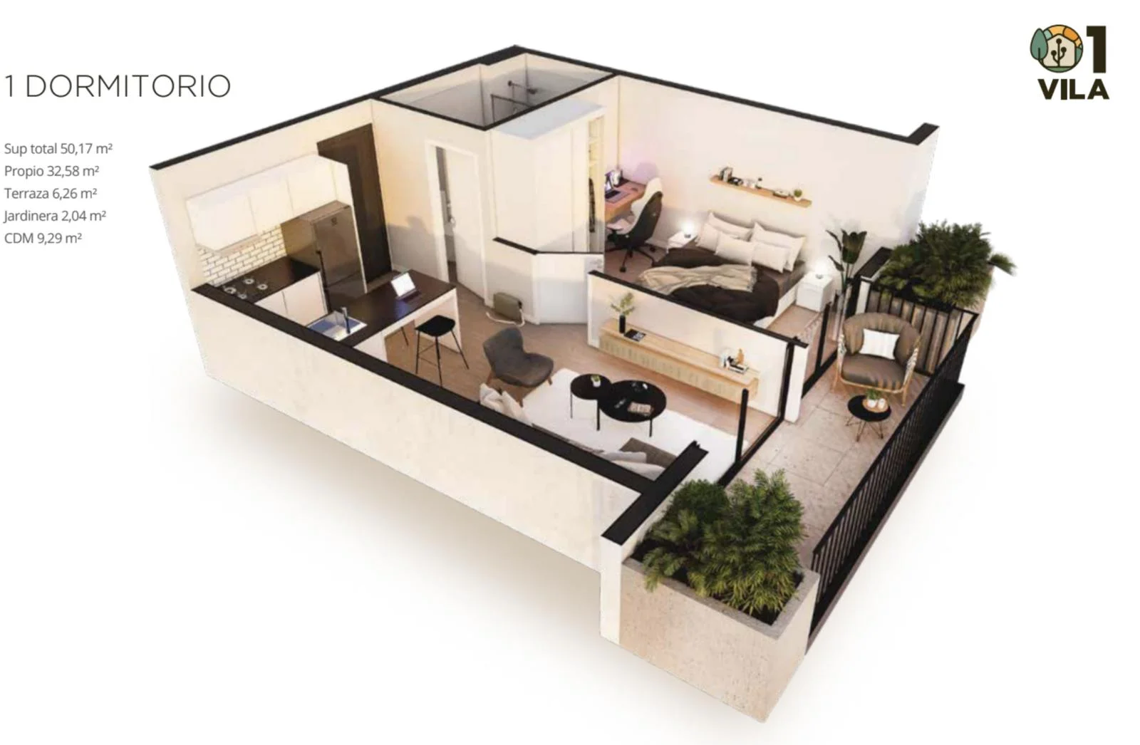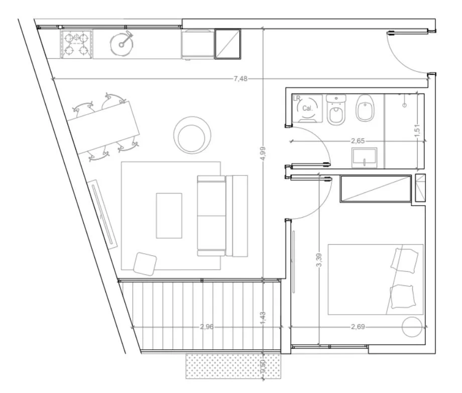 Living comedor cocina integrada y salida a balcón.