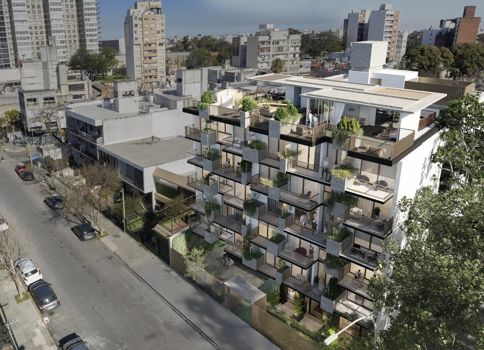 Subsuelo con cocheras opcional a 20.000 dólares y bike parking para todos los apartamentos. El ingreso al edificio en planta baja se caracteriza por tener un camino singular con espacios de bike parking y postas verdes que serán espacios destinados para estar, disfrutar, leer o trabajar. Además, el hall del edificio posee un área de cowork interior.