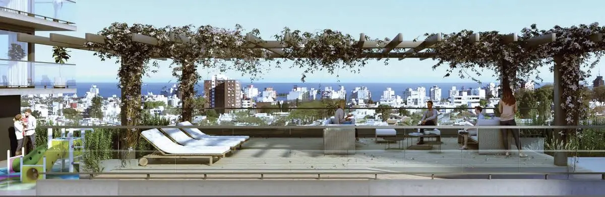 Espacio exterior pergolado, con livings y sectores enjardinados.