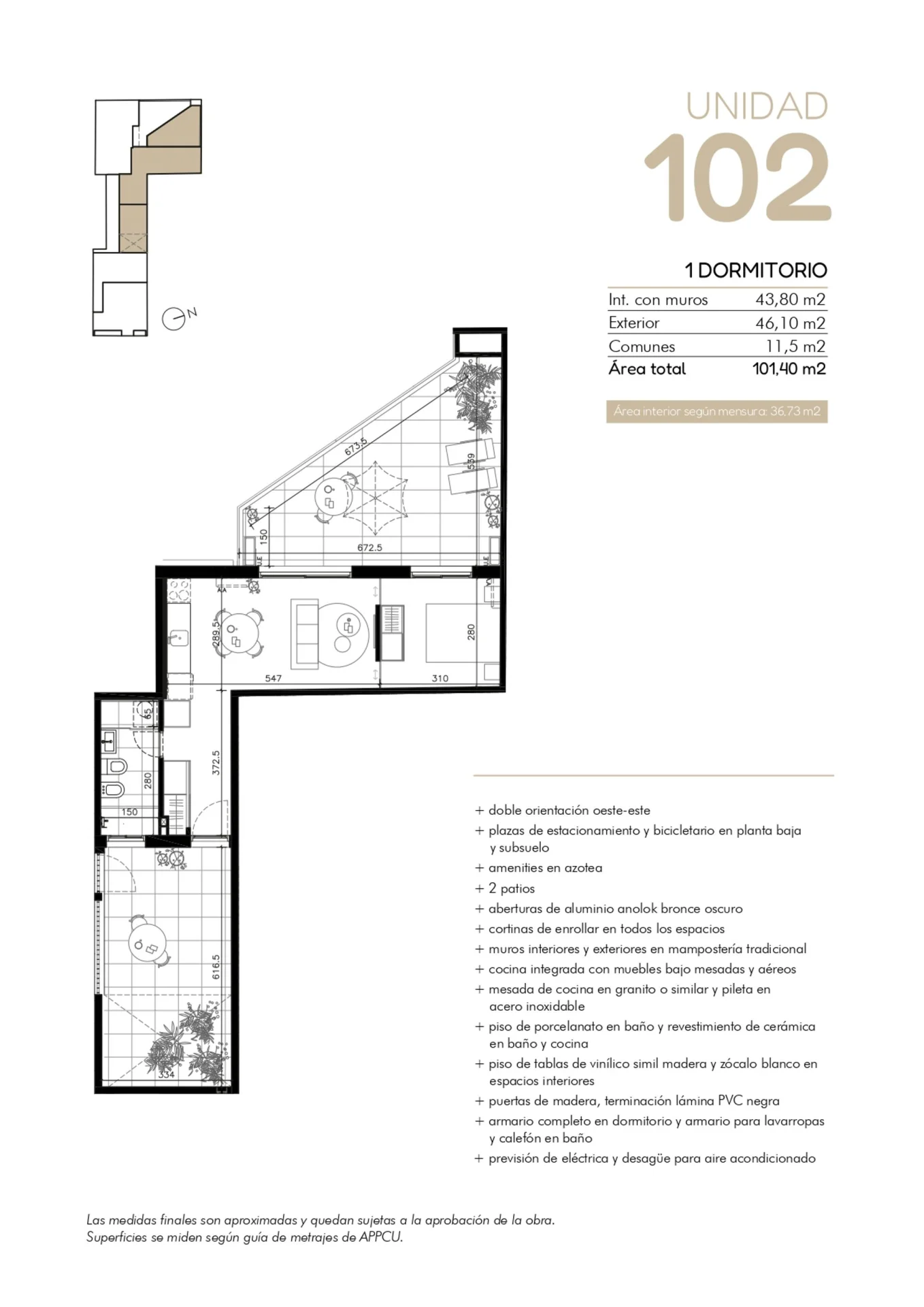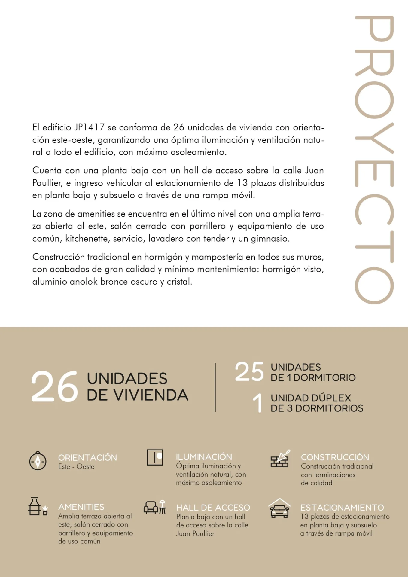 Corredor Responsable: - Contacto: Silvina Viola DEPARTAMENTO DE UN 1 DORMITORIO CON 2 TERRAZAS EN VENTA EN CORDÓN, MONTEVIDEO - EN POZO Departamento 1 dormitorio ubicado sobre la calle Juan Paullier, en el barrio de Cordón, Montevideo. Situado en el piso 1 de un edificio de 10 pisos. Cuenta con una superficie total construida de 43,80 mts. internos y 46,10 exteriores : una terraza al frente (con desagüé para lavarropa) y una terraza al fondo. (Ver plano). Distribuido en living con cocina integrada al frente. Terraza al frente. 1 baño, 1 Dormitorio con armario completo y otro independiente para el calefon. Muros interiores en mampostería tradicional. Cocina integrada con muebles bajo mesada y aéreos. . Previsión eléctrica para desagüe para aire acondicionado. AMENITIES - Salón cerrado con parrillero, kitchenette, y equipamiento de uso común. - Amplias terrazas. - Laundry. Todos los beneficios fiscales de la Ley de Promoción de Vivienda COSTOS - Comisión inmobiliaria: 3% + IVA - Gastos de ocupación: 4% - Garajes disponibles por U$S 19.000(2-3-9-10) y U$S 21.000 (1-8) FORMA DE PAGO - Compromiso 40% - Cuotas obra 50% - Ocupación 10% Entrega prevista : MARZO 2027 Desarrolla Bangkok Group. Compartimos con todos los colegas inmobiliarios. No dudes en consultarnos! Cada Oficina es de propiedad, gestión y desarrollo independiente La presente publicación describe las características esenciales del inmueble, debiéndose consultar al responsable de la operación por la eventual actualización de las medidas, descripciones arquitectónicas y funcionales, servicios, impuestos, precios y demás información, cuyos valores son aproximados.