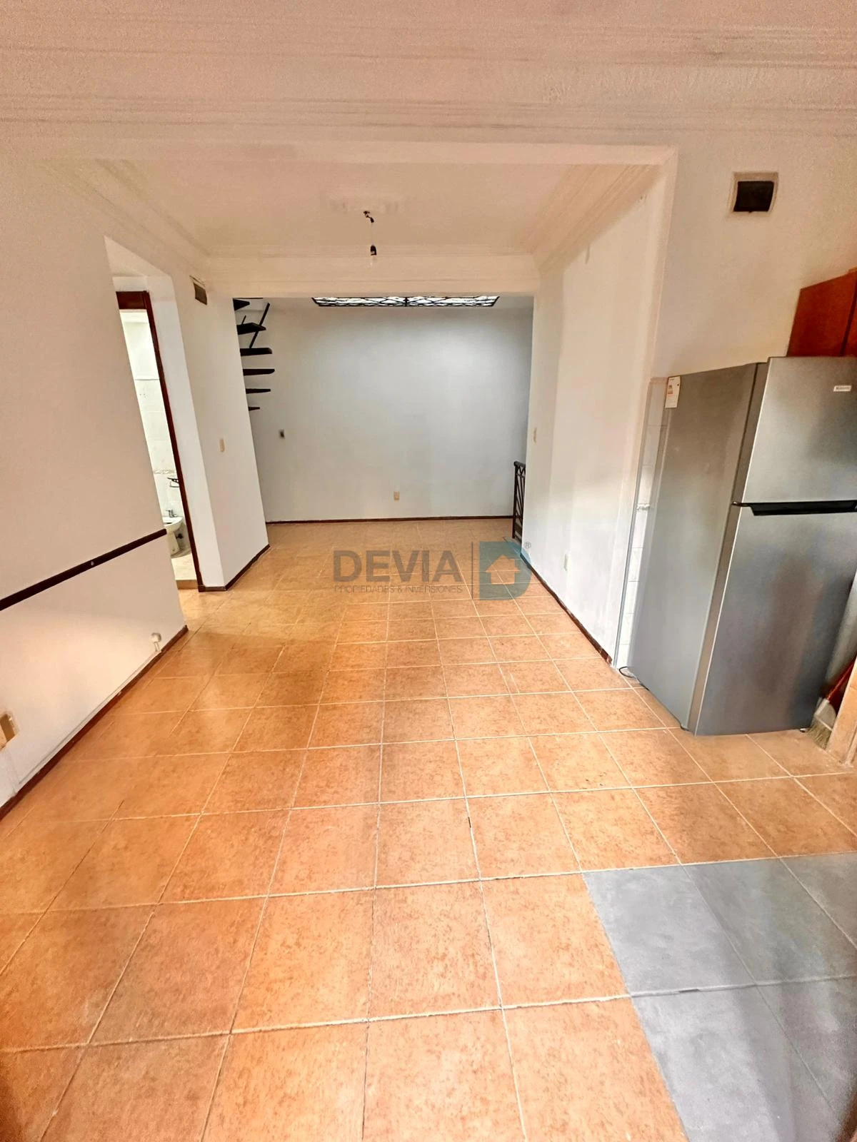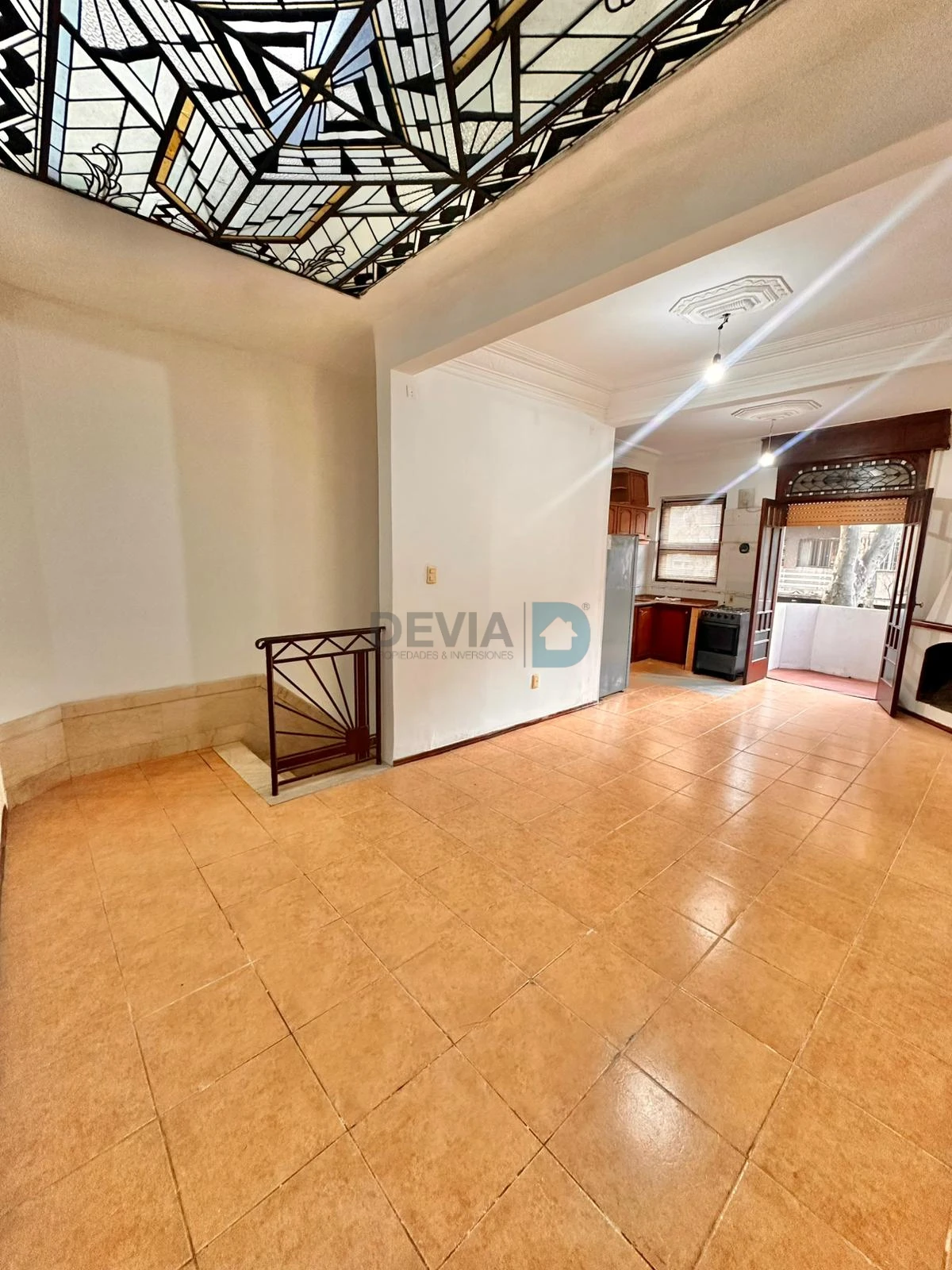 Living comedor amplio con cocina integrada, estufa a leña y balcón