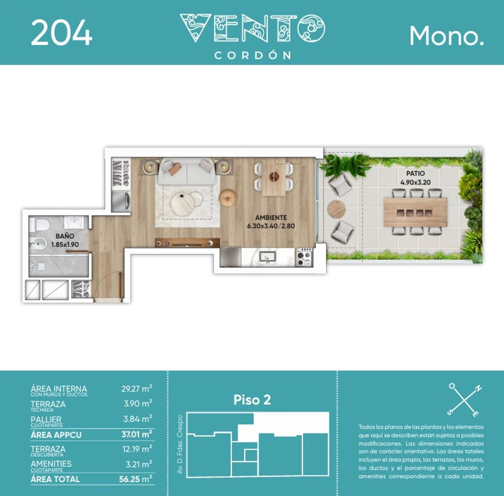 Corredor Responsable: - Contacto: Valeria Cruz Venta Cordon Monoambiente con Patio Estrena 2026 Vento Cordon, Ubicado ensobre Fernández Crespo entre Uruguay y Paysandú a 2 cuadras del Bps y 18 de Julio. Estrena Junio 2026 Es proyecto moderno y funcional de construcción tradicional pensado tanto para vivir como inversión. Amenities: Espacio común tipo SUM / cowork con parrillero interior, barra, estar y doble terraza solárium panorámica Laundry Disponemos de Showroom para ver terminaciones. Gastos de ocupación 4,5% Además, el proyecto se desarrolla al amparo de la Ley de Vivienda Promovida (Ley 18.795), lo que brinda importantes beneficios fiscales para inversores: Exoneración del ITP Exoneración del IRAE/IRPF sobre alquileres por 10 años Exoneración del Impuesto al Patrimonio por 10 años Cada Oficina es de propiedad, gestión y desarrollo independiente La presente publicación describe las características esenciales del inmueble, debiéndose consultar al responsable de la operación por la eventual actualización de las medidas, descripciones arquitectónicas y funcionales, servicios, impuestos, precios y demás información, cuyos valores son aproximados.