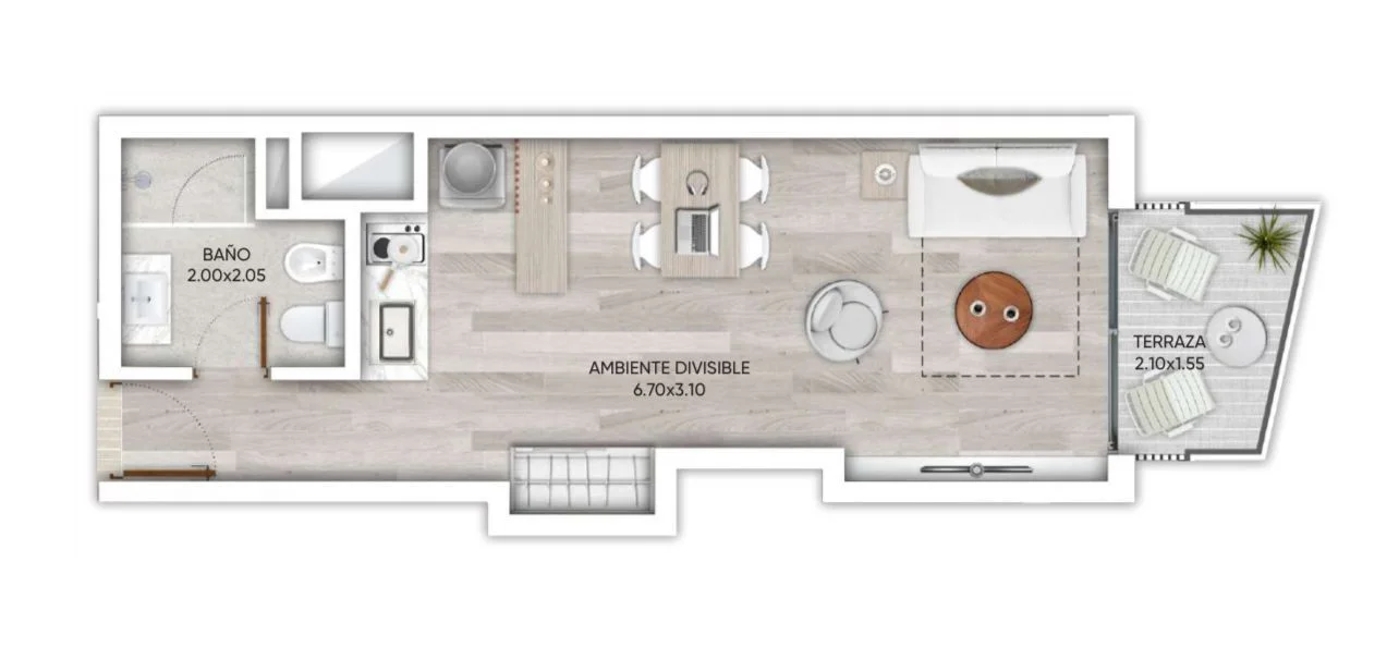 Mono: 119.800 Venta monoambiente con terrCon excelente ubicación, cercano a servicios, transporte, áreas verdes, centros deportivos y educativos. Superficie interior: 30 m2 Superficie exterior: 3 m2 Orientacion norte Distribución: Espacio principal con placares Cocina integrada con desayunador Baño completo Balcón al frente Los apartamentos incluyen conexión para lavadora, previsión para domótica y entrada inteligente. El edificio cuenta con bike parking, local comercial en planta baja, cámaras CCTV, laundry, azotea con parrilleros de uso común y barbacoa abierta. Gastos de conexión: 4,25% Cocheras desde USD 25.000 Por más información, estamos a las órdenes. S.B.R. . Caracteristicas: BALCON, GARAJE, LAVANDER?A, LIVING COMEDOR, LAUNDRY, PLACARD EN COCINA, PLACARD EN DORMITORIO, SEGURIDAD, AGUA CORRIENTE, COCINA, LUZ ELECTRICA, PORTERO ELECTRICO, WIFI, PLACARDS XINTEL (SBS-SBS-191)