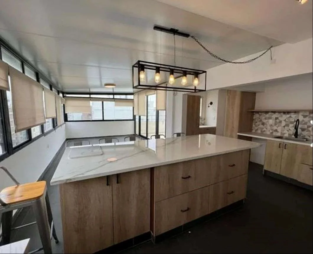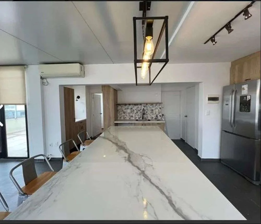 Comedor definido. Dormitorio principal en suite con cómodo walk-in closet. Cocina de concepto abierto con isla central y espacio diario, también con salida directa a la terraza, generando una integración perfecta entre interior y exterior. Baño social.