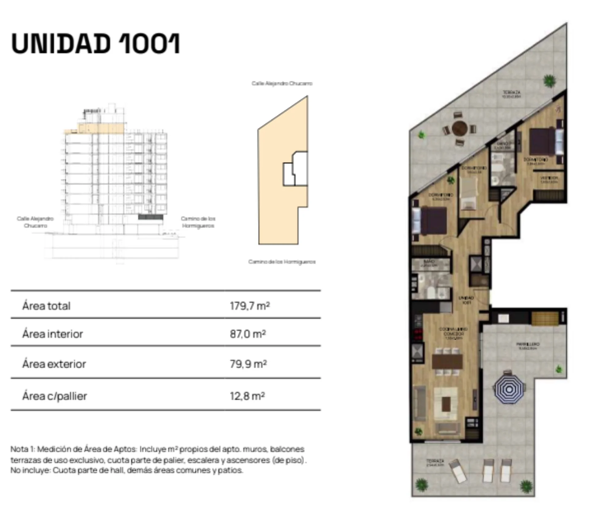 Corredor Responsable: - Contacto: Andrea Goldberg Lanzamiento del edificio \\\"DEL MAR\\\", a tan solo una cuadra de la Rambla, y playa de Pocitos. En uno de los lugares con mayor cantidad de servicios, desde supermercado, farmacia, panadería, y club deportivo. Va a ser un edificio, con características particulares, ya que tendrá ambas fachadas principales, una hacia la calle Alejandro Chucarro, y la otra hacia Camino de los Hormigueros. Sera un edificio de viviendas, en tipología de monoambiente, un dormitorio, y dos dormitorios. En el último piso tendrá barbacoa con parrillero sala de ejercicios y lavadero común. La unidad es un penthouse que cuenta con tres dormitorios, uno de ellos en suite y todos con salida a una de las terrazas que da hacia Chucarro. Además cuenta con otro baño completo. La cocina está integrada al living comedor el cual tiene acceso al parrillero. Compartimos con todos los colegas inmobiliarios Comisión inmobiliaria 3% + IVA Gastos conexión 4% Garajes disponibles por USD 27.000 Edificio construido por el arquitecto Lipatin. Cada Oficina es de propiedad, gestión y desarrollo independiente La presente publicación describe las características esenciales del inmueble, debiéndose consultar al responsable de la operación por la eventual actualización de las medidas, descripciones arquitectónicas y funcionales, servicios, impuestos, precios y demás información, cuyos valores son aproximados.