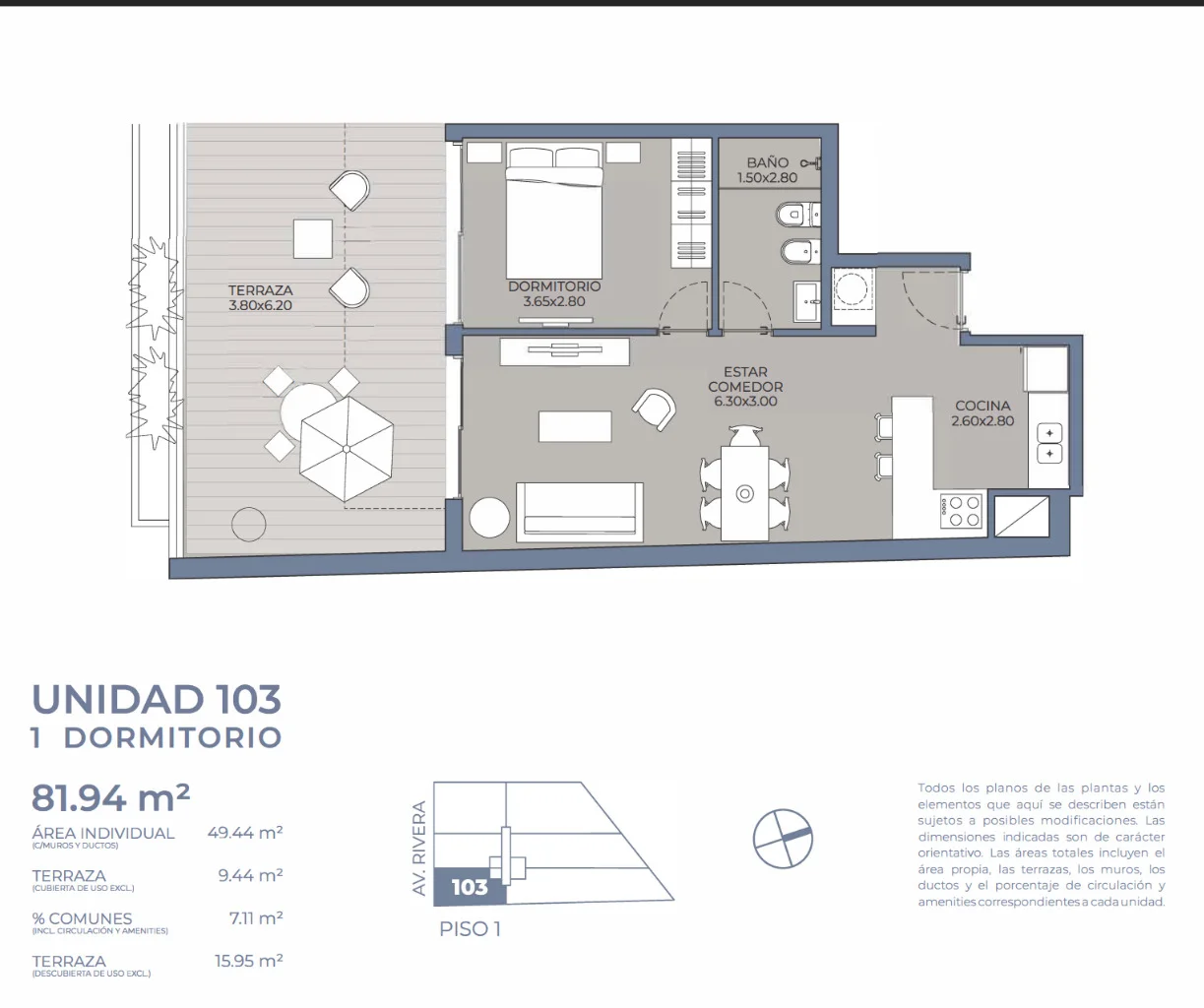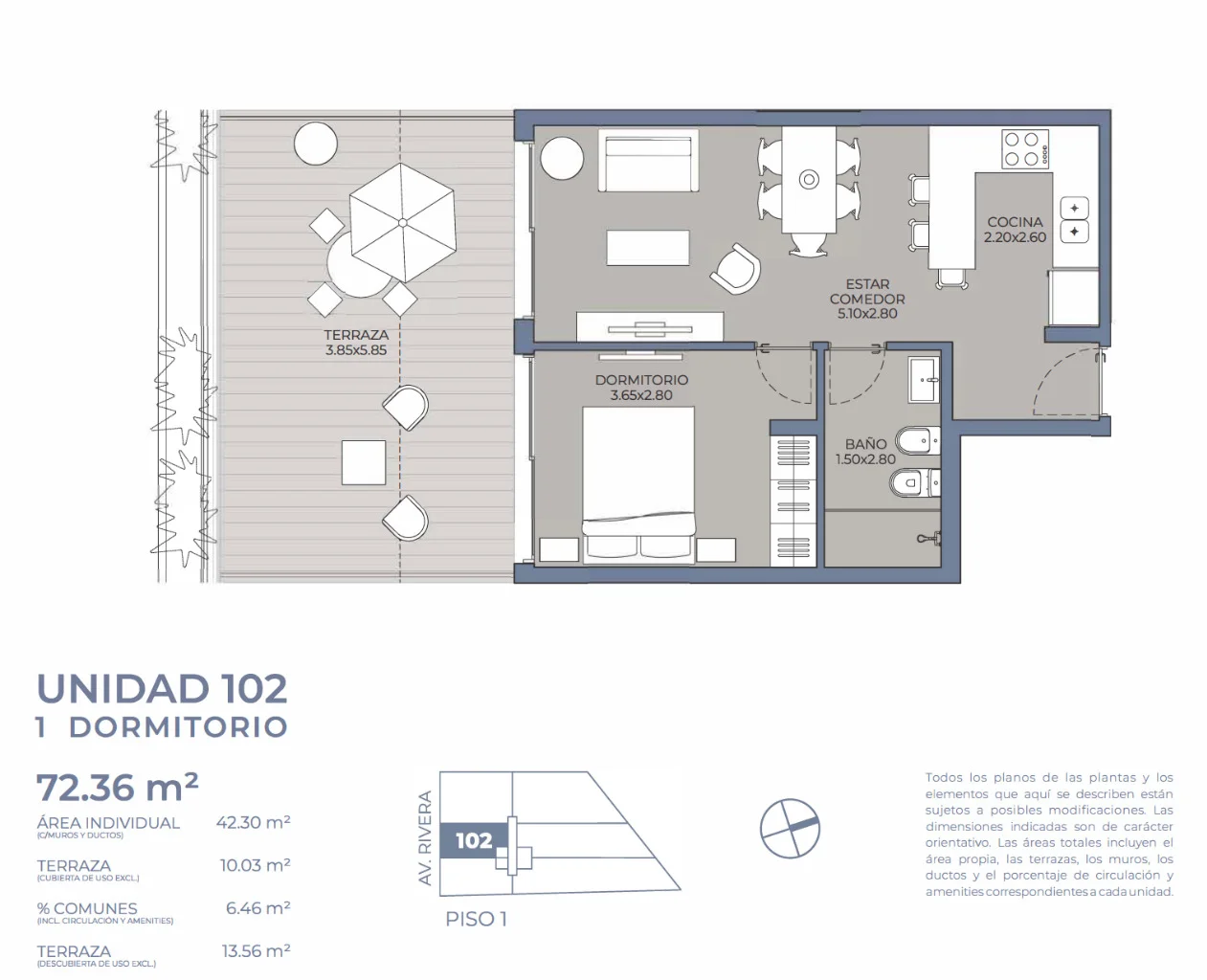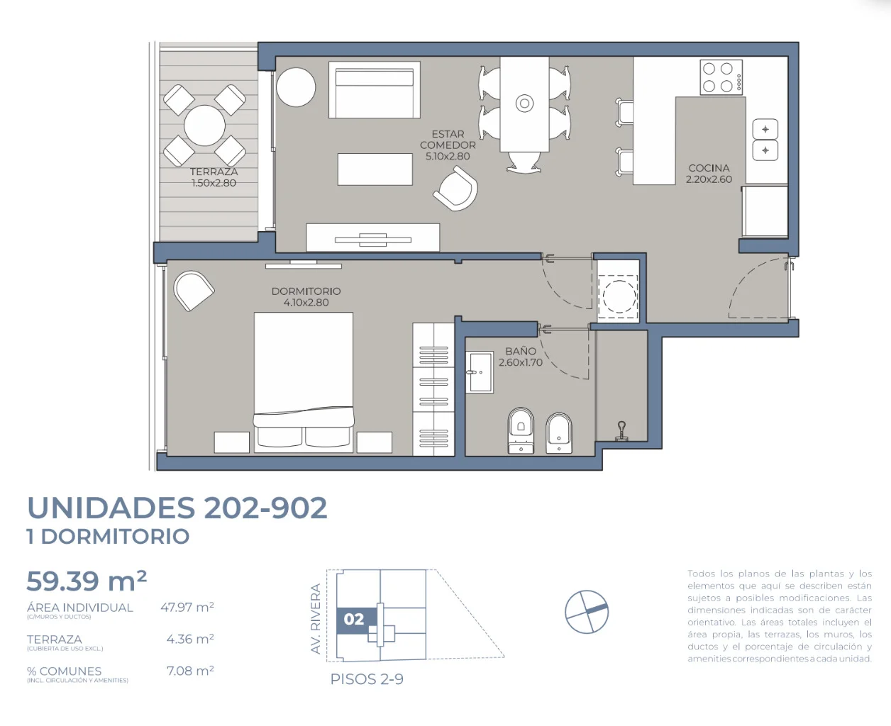 Brío Rivera, ubicado en Rivera entre Ponce y Obligado (Pocitos), ofrece apartamentos de 1 dormitorio, ideales para vivir o invertir. Unidades con diseño contemporáneo, excelente distribución y terraza privada con parrillero tipo Kamado. Superficie aproximada: 42 a 46 m² interiores + terrazas de 8 a 14 m² (totales entre 55 y 63 m²). Comodidades y amenities: - Barbacoa con terraza 360° en piso 11 - Gimnasio panorámico - Lavandería con app - Guardabicis - Garajes en planta baja y subsuelo Precios: Desde USD 144.623* Garajes desde USD 31.000 Financiación a medida. honorarios inmobiliarios (3% + IVA). Consulte por más unidades y tipologías sin compromiso, con gusto lo atenderemos.