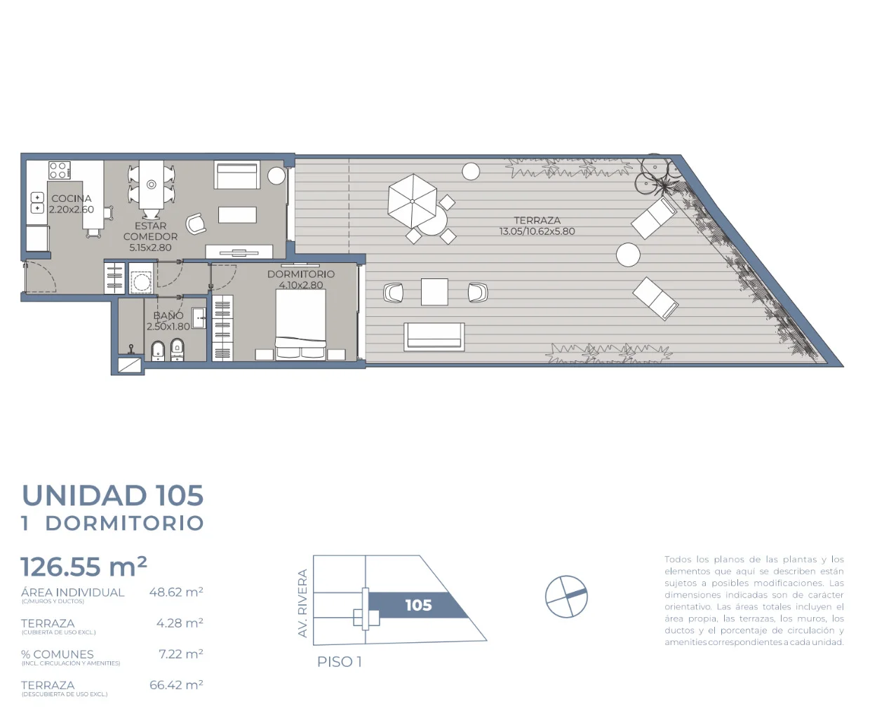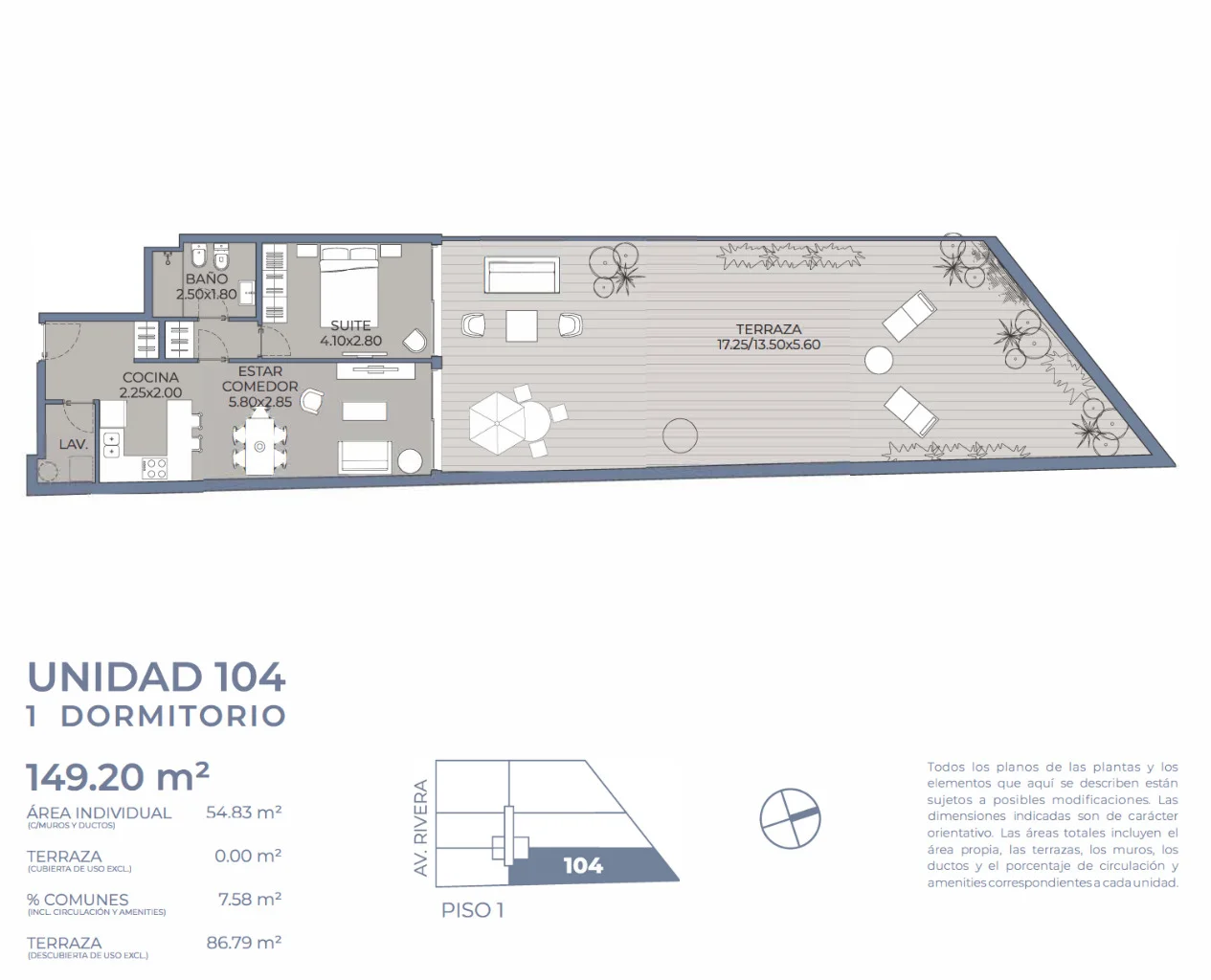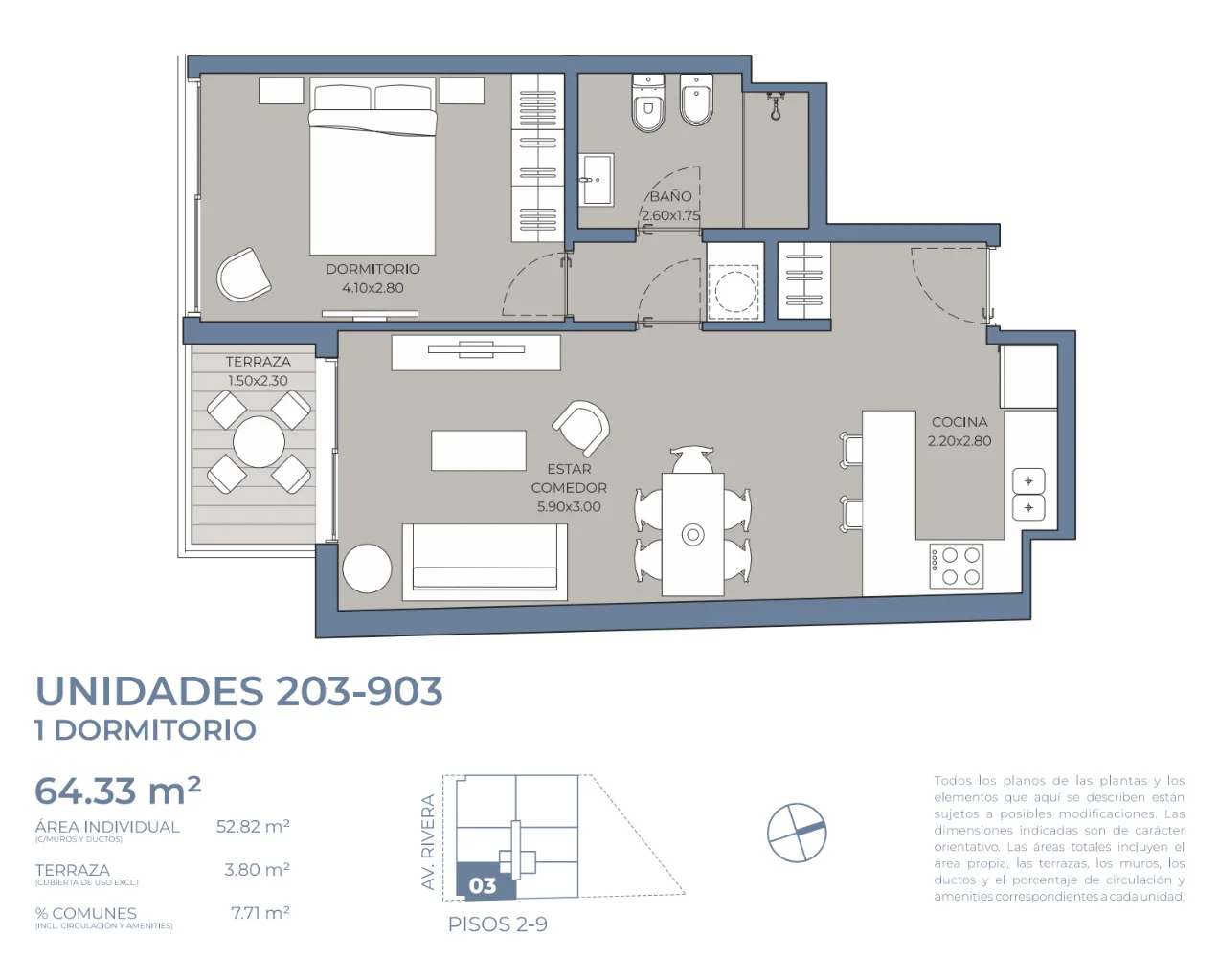 Brío Rivera, ubicado en Rivera entre Ponce y Obligado (Pocitos), ofrece apartamentos de 1 dormitorio, ideales para vivir o invertir. Unidades con diseño contemporáneo, excelente distribución y terraza privada con parrillero tipo Kamado. Superficie aproximada: 42 a 46 m² interiores + terrazas de 8 a 14 m² (totales entre 55 y 63 m²). Comodidades y amenities: - Barbacoa con terraza 360° en piso 11 - Gimnasio panorámico - Lavandería con app - Guardabicis - Garajes en planta baja y subsuelo Precios: Desde USD 144.623* Garajes desde USD 31.000 Financiación a medida. honorarios inmobiliarios (3% + IVA). Consulte por más unidades y tipologías sin compromiso, con gusto lo atenderemos.
