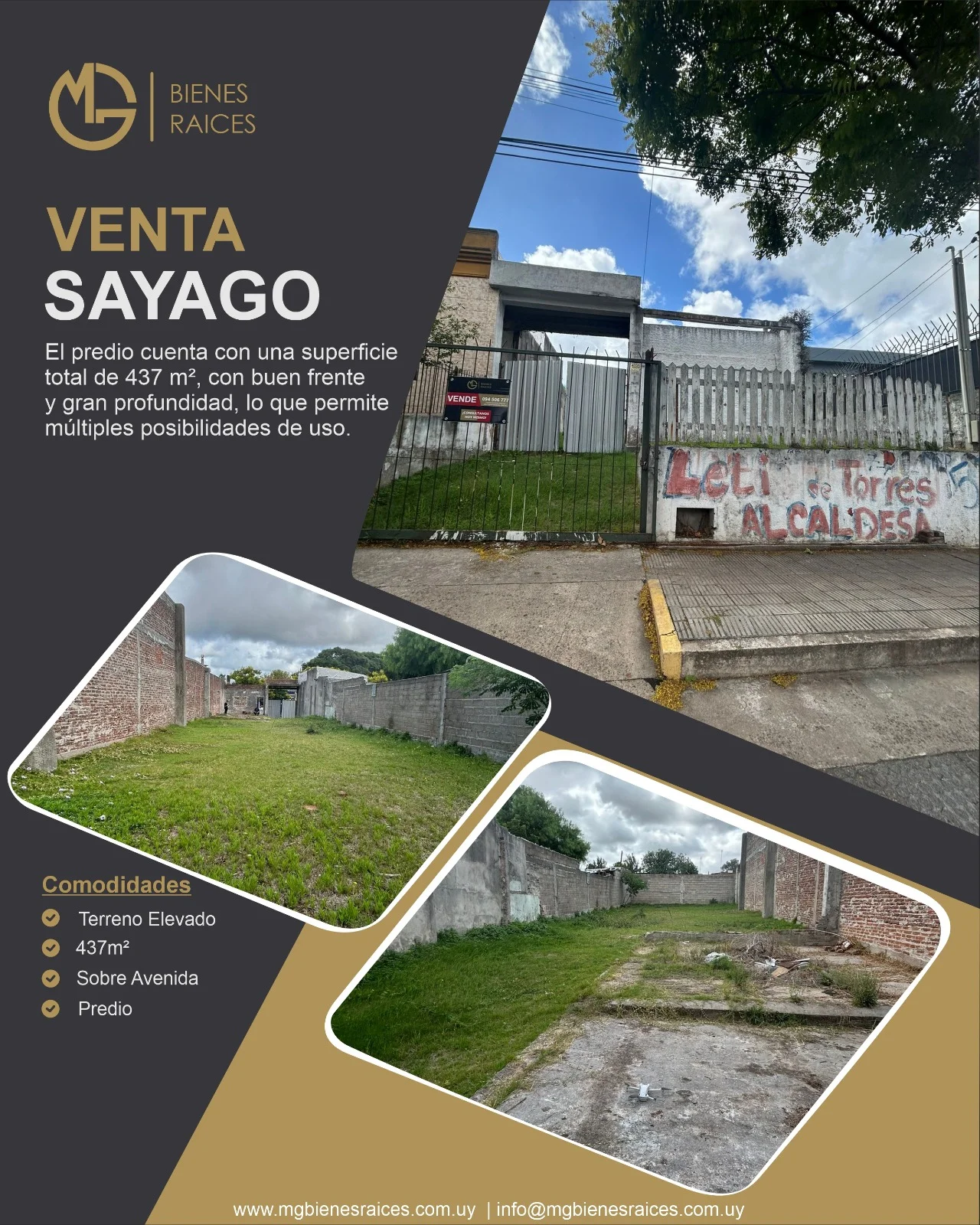 ? Terreno en venta en Sayago – Sobre Av. Garzón ? Excelente oportunidad de inversión en una de las avenidas principales de Sayago. Terreno ubicado sobre Av. Garzón, con muy buena visibilidad y gran flujo de circulación, ideal tanto para proyecto residencial como para desarrollo comercial. El predio cuenta con una superficie total de 437 m², con buen frente y gran profundidad, lo que permite múltiples posibilidades de uso. Se encuentra totalmente cercado con muros laterales, brindando seguridad y delimitación clara del terreno. Al ingresar nos encontramos con un espacio amplio y despejado, con sectores de piso firme y áreas verdes, permitiendo proyectar distintas opciones de construcción, depósito, local comercial o viviendas. Cuenta con portón de acceso al frente, facilitando el ingreso vehicular y haciendo la propiedad muy práctica para uso comercial o logístico. ? Ubicación estratégica sobre Av. Garzón, en una zona con gran circulación, comercios, servicios y excelente locomoción. ✨ Ideal para: ? Proyecto comercial ? Depósito o empresa ? Desarrollo de viviendas ? Inversores Precio USD 90.000 ? Comercializa: MG Bienes Raíces Corredores Oficiales Porto Seguro, Sancor, SURA y Fideciu Afiliados a ADIU y CIU – Equifax Clearing ? Londres 3401A, Montevideo ? *** | *** ? www.mgbienesraices.com.uy ✉️ [email protected]