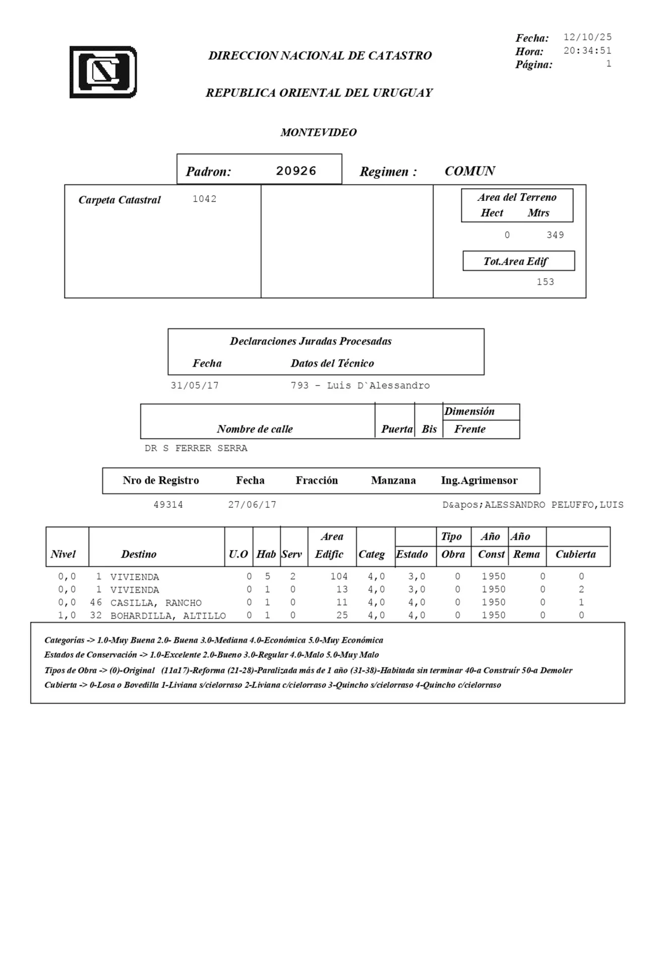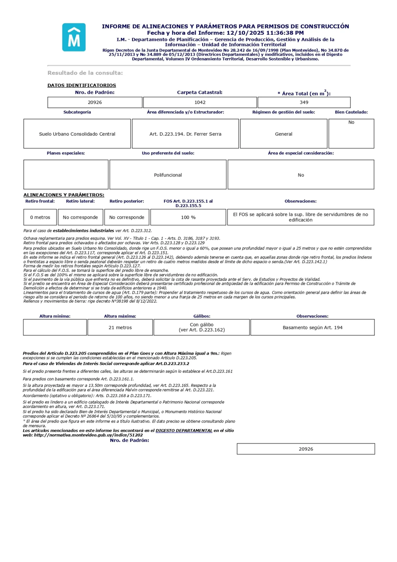 Corredor Responsable: - Contacto: Nicolás Folle Delgado Se vende padrón de 349m2 ubicado sobre Dr. Salvador Ferrer Serra. Oportunidad estratégica en Tres Cruces, una de las zonas de mayor dinamismo residencial e inversión de Montevideo. + Informe de Alineaciones del padrón: Número de padrón: 20926 Terreno: 349 m² / Construido: 153 m² FOS (Factor de ocupación del suelo): 100 % Frente: 9.52m / Profundidad: 36.83m Retiro frontal: 0 m Sin retiro lateral ni posterior Altura máxima: 21 m + opción de gálibo Oportunidad para inversores y desarrolladores: Excelente ubicación, con conectividad de transporte, servicios, comercios y gran demanda de vivienda en altura. Cada Oficina es de propiedad, gestión y desarrollo independiente La presente publicación describe las características esenciales del inmueble, debiéndose consultar al responsable de la operación por la eventual actualización de las medidas, descripciones arquitectónicas y funcionales, servicios, impuestos, precios y demás información, cuyos valores son aproximados.