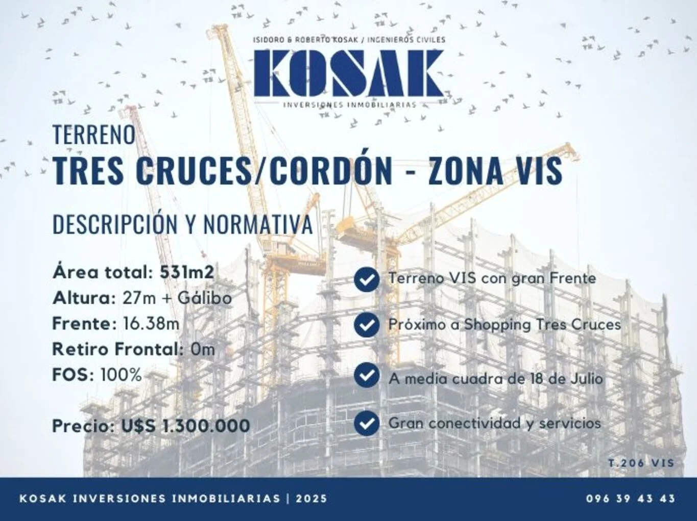 KOSAK INVERSIONES INMOBILIARIAS - TERRENOS Terreno con gran frente a media cuadra de 18 de Julio. Ubicación próxima al Shopping Tres Cruces, a 3 cuadras de Br. Artigas, y cerca del Parque Batlle. Zona comercial y residencial con servicios y gran conectividad. Área total: 531m2 Altura: 27m + Gálibo Frente: 16,38m Retiro: 0m FOS: 100% Por consultas comunicarse con Arq. Valentina Kosak - 096394343