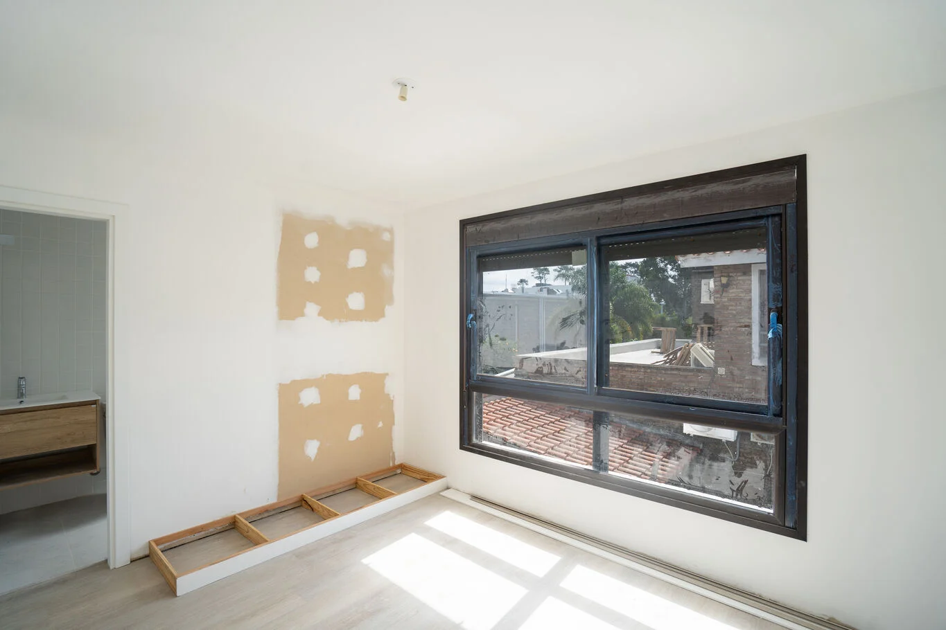 Planta baja: living comedor con estufa de alto rendimiento y salida al jardín con pérgola.