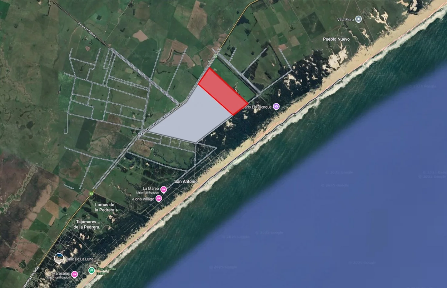 De un lado se recuesta sobre la ruta 10 y del otro sobre la zona de médanos y playa.
