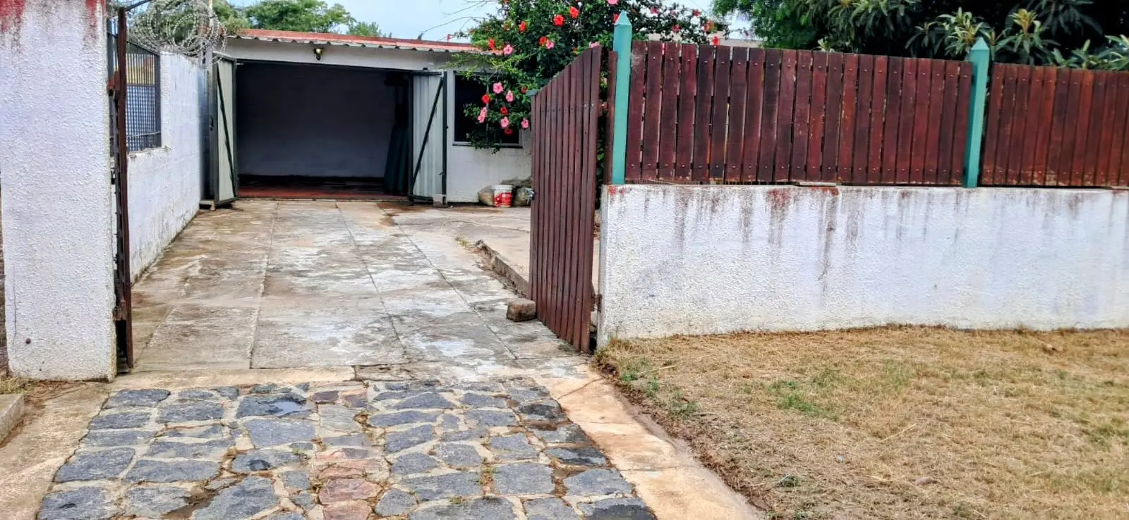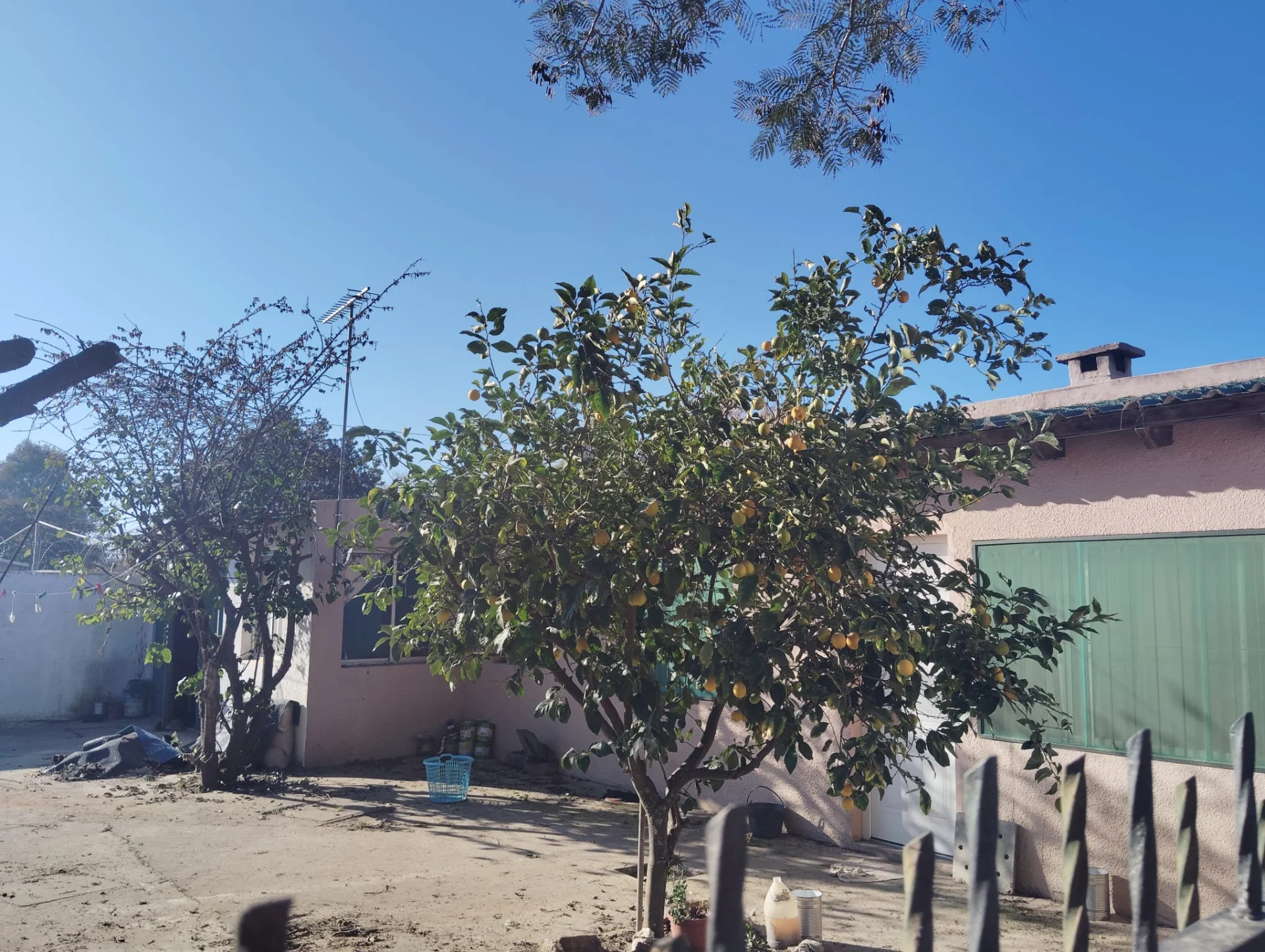 PATIO trasero de piso de hormigón con portón grande en hierro y madera corredizo para entrada de vehículo. Con algunos ÁRBOLES, limonero, anacahuita, níspero y otros.