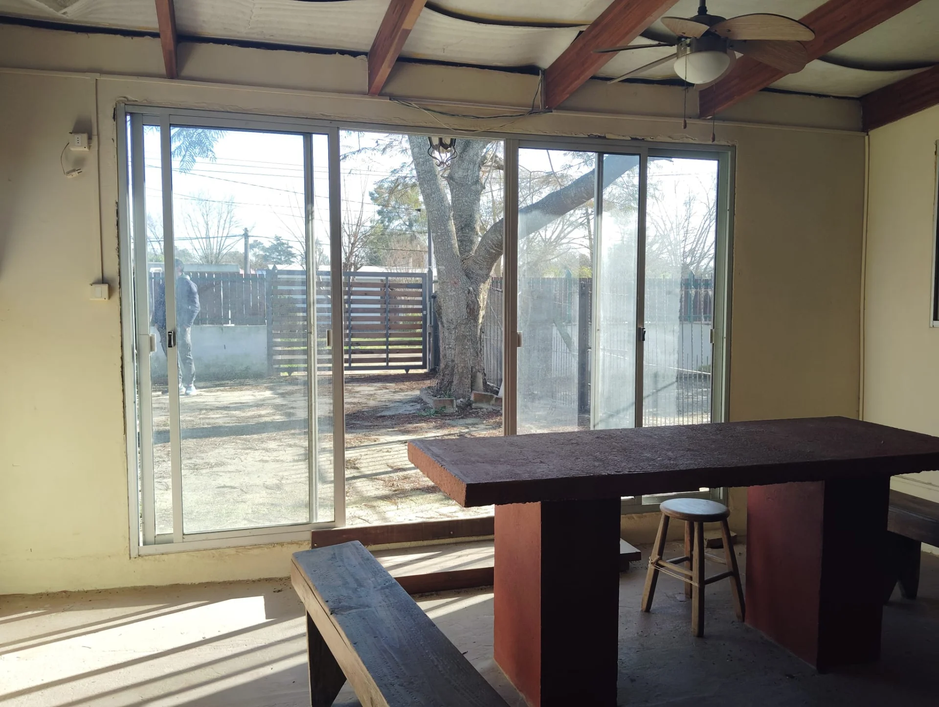 PORCHE de entrada todo cerrado con cerramiento con ventanas grandes y ventilador de techo.