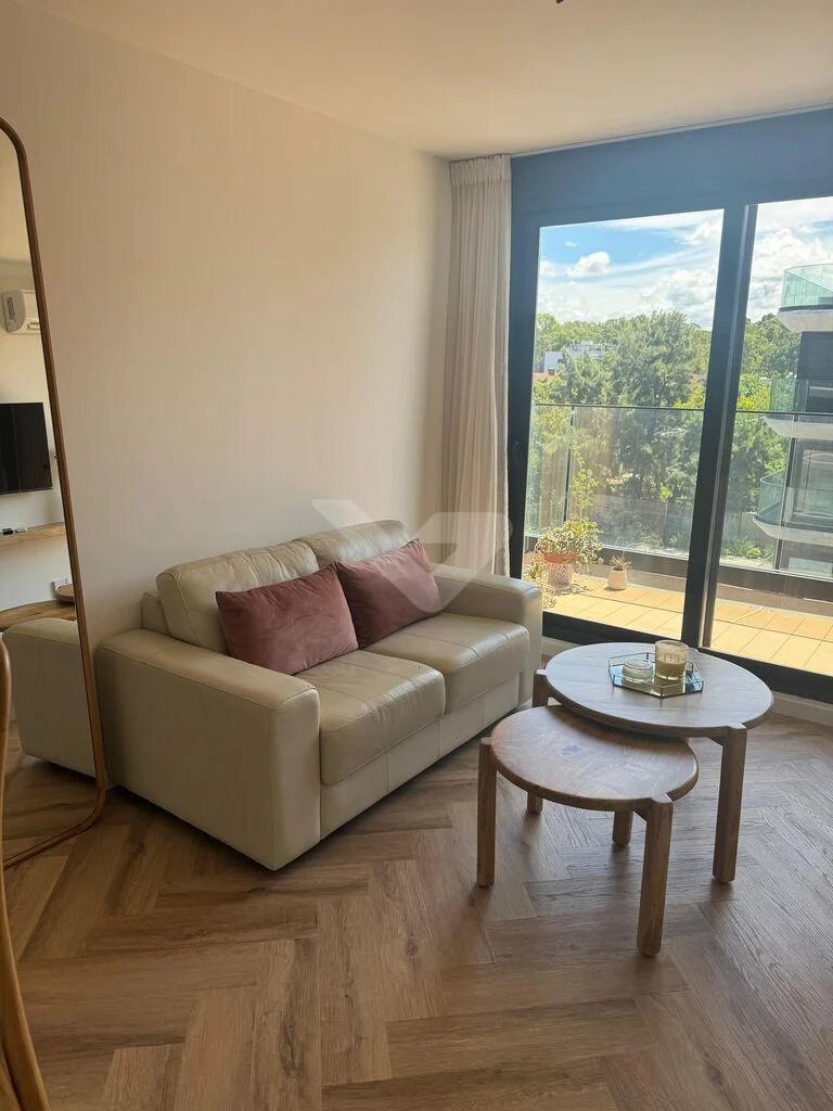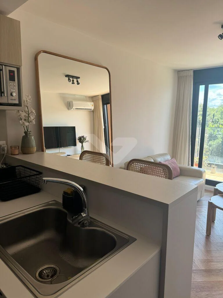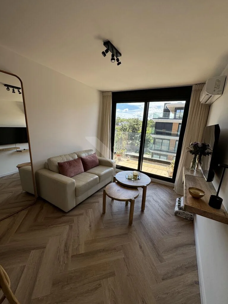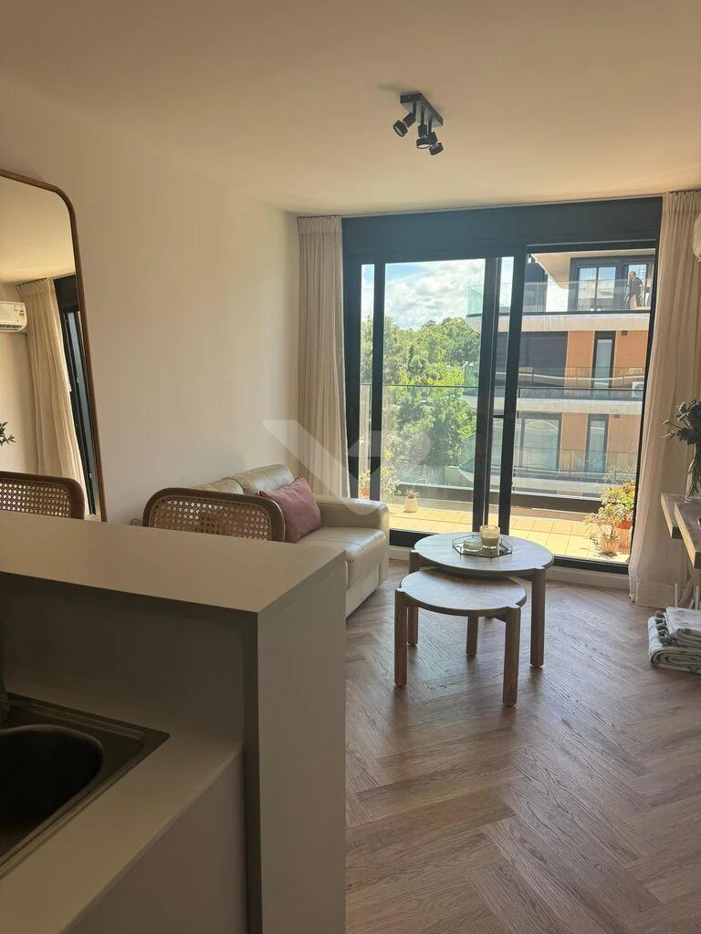 Living comedor integrado mediante barra a la cocina con horno, anafe y campana. Placard para calefón. Living comedor con aire acondicionado, y salida a terraza con gran luz.