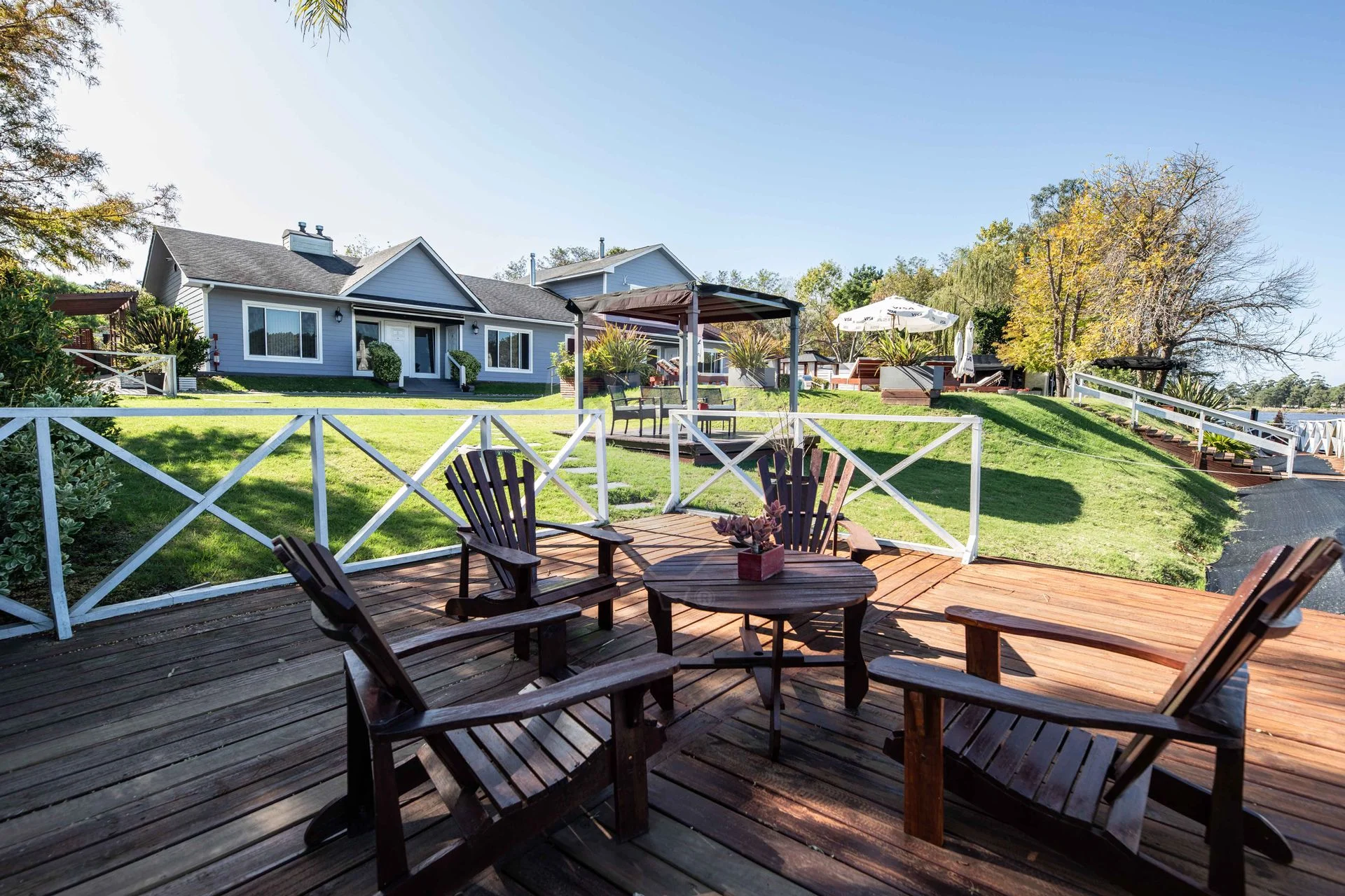 Varias pérgolas de madera con vista al arroyo.