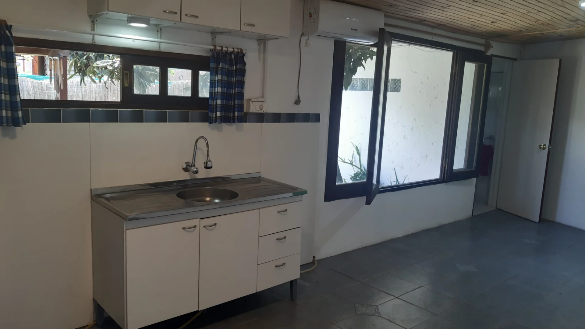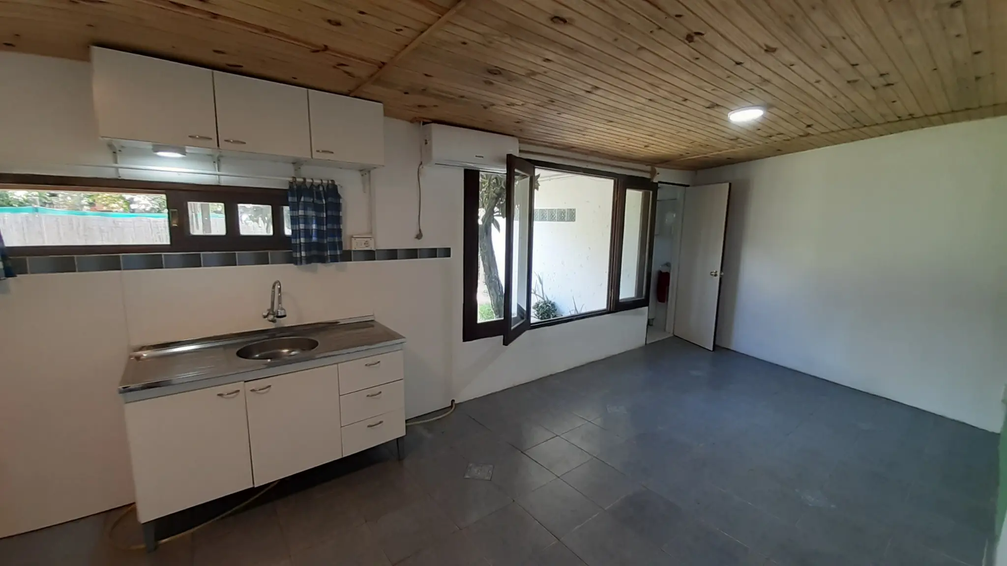 Cómodo Monoambiente de 28 mts2, con kitchenette, baño, ventanal, aire acondicionado, calefón a gas (gran ahorro) y porche. Instalación para lavarropas.