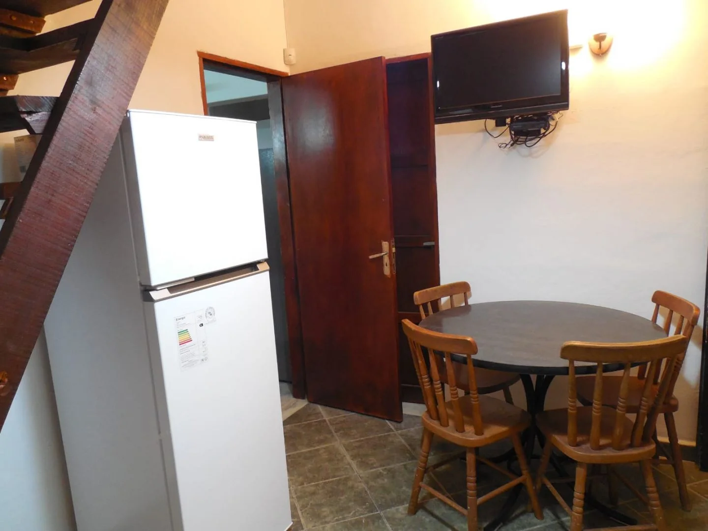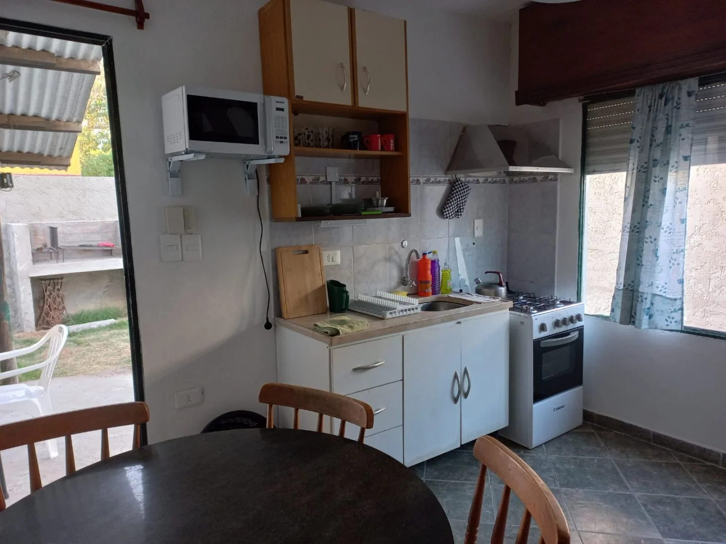 La cocina tiene microondas, heladera con freezer, extractor de aire, calefón de 30 litros, cocina combinada, pequeños electrodomésticos y vajilla para 4 personas.