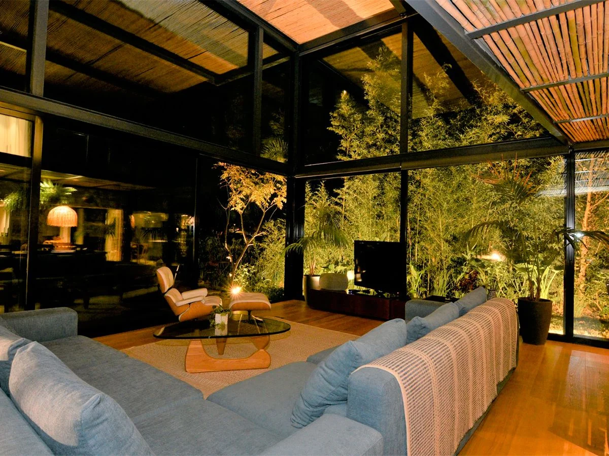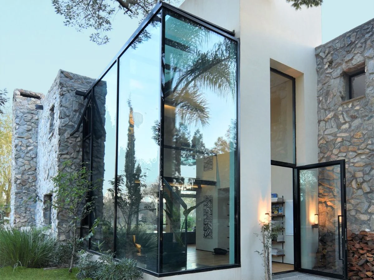 El vidrio y la piedra son los protagonistas. La transparencia del vidrio, permite que en el verano la casa quede protegida por la frondosidad de los árboles, haciéndola casi invisible desde la calle y protegiéndola del sol; y en el invierno los árboles caducos pierden sus hojas, permitiendo que los rayos del sol penetren y calienten su interior.