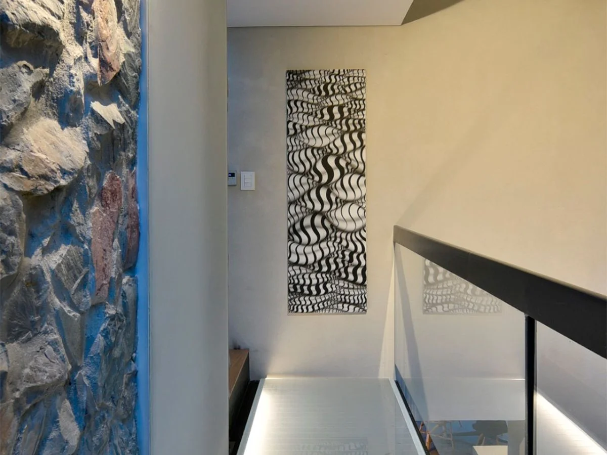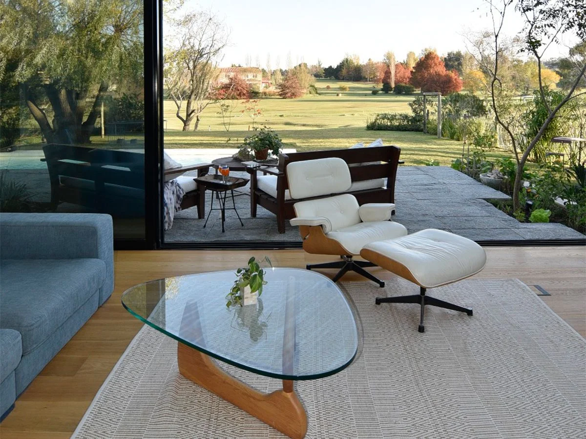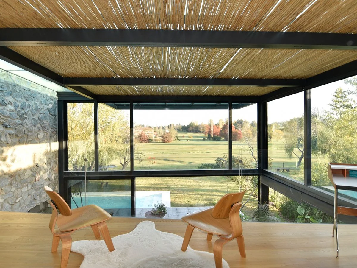 Casa en Lomas de La Tahona de gran diseño, inspirada en el paisaje natural del lugar, un terreno rodeado de árboles maduros, increíblemente rasgado por una cañada y una magnífica vista abierta hacia el campo de golf. Desarrollo de la Arq. Karin Bia.