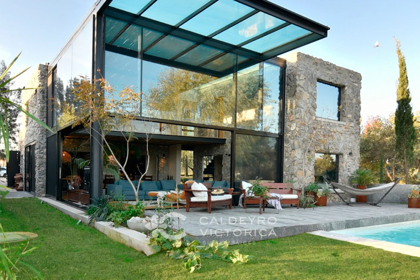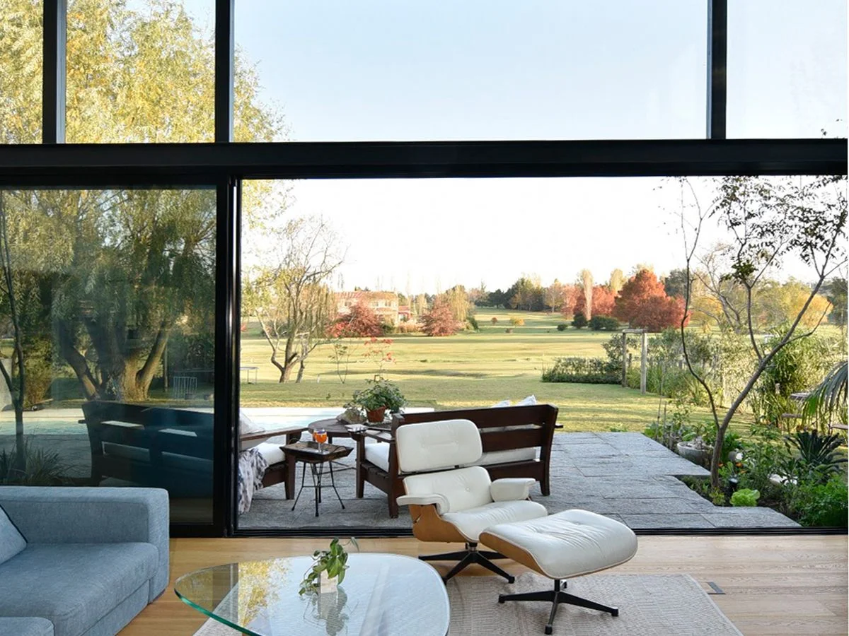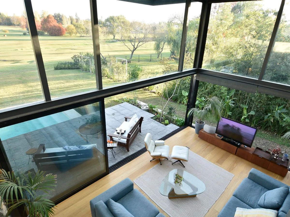 Amplio living comedor (7,50m x 7,50m) con ventanales de piso a techo que lo integran al paisaje. Salida al jardín con deck en losas de piedra de granito flameado, gran piscina climatizada, parrillero y huerta. Cocina con gran isla central (2,80m de longitud) diseño gourmet, equipada con horno y microondas de empotrar, lavavajillas, anafe y campana de empotrar en cielorraso. Todo el equipamiento es de alta gama línea Bosch. Integrada al comedor diario, con horno a leña y ventanales de piso a techo. Sala de estar con estufa a leña. Toilette. Lavadero y servicio completo. En PA 3 dormitorios en suite. Gran estudio en entrepiso con vista al campo de golf. Cochera.