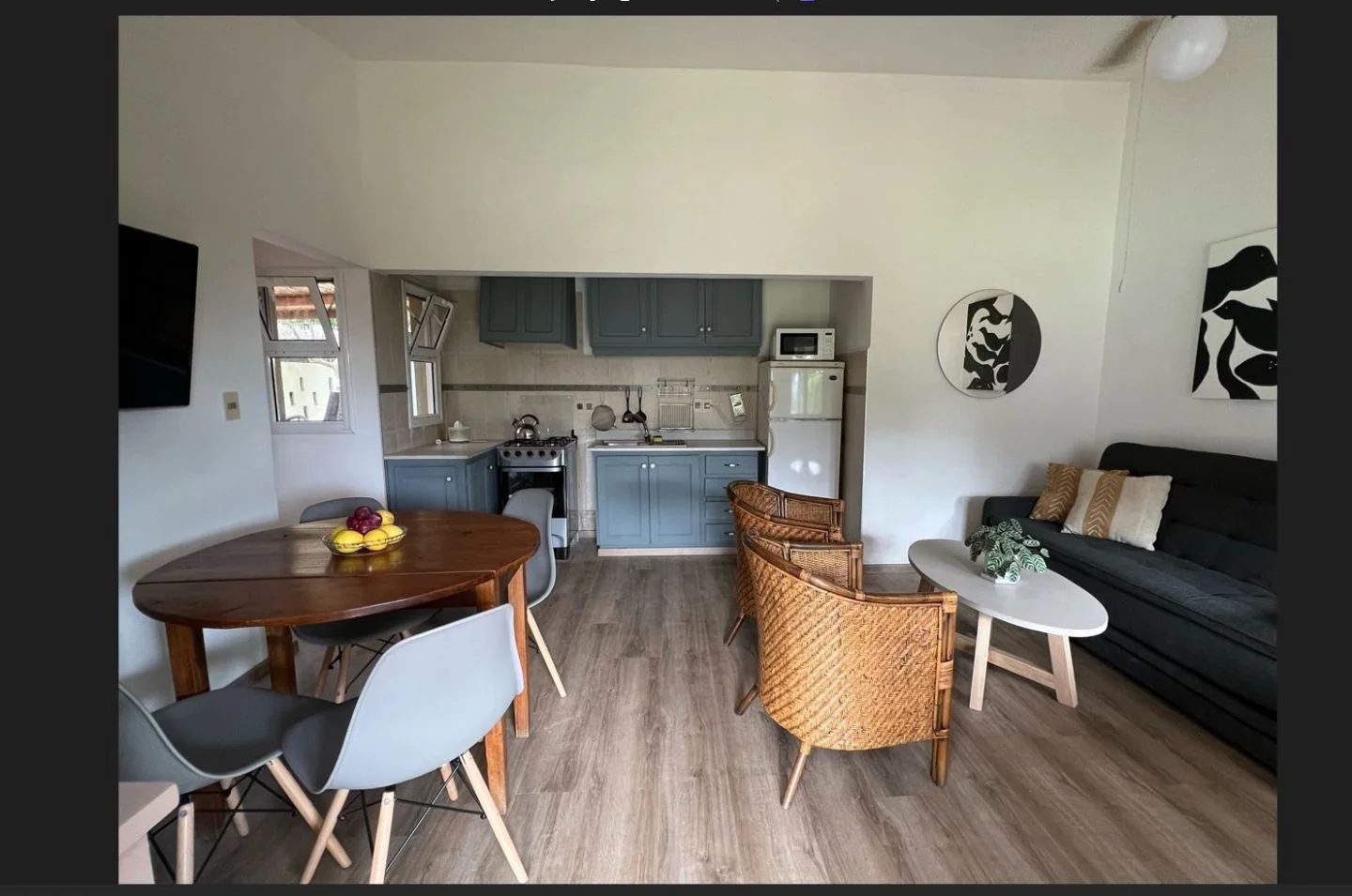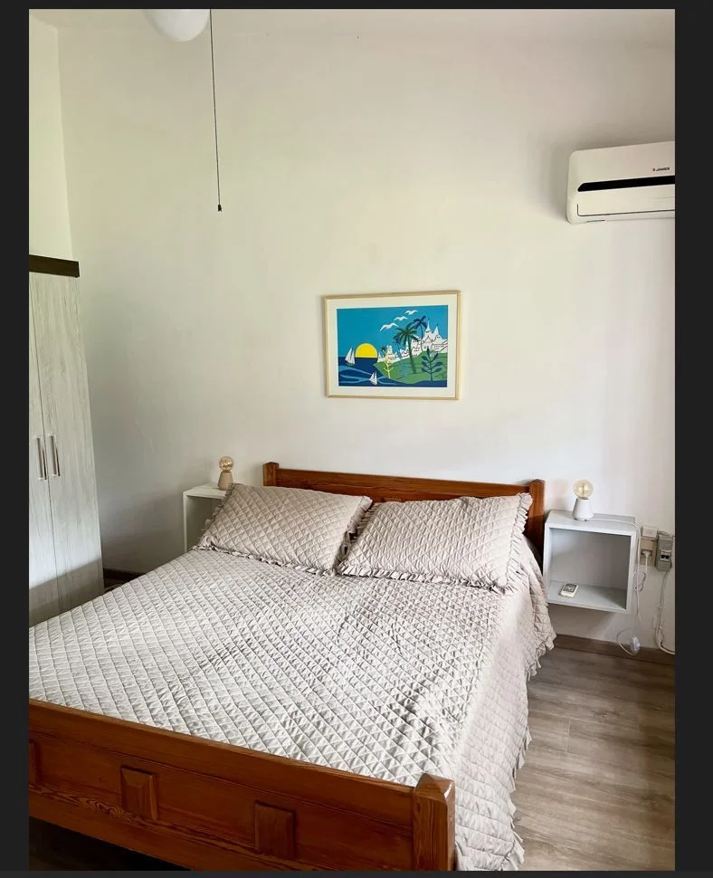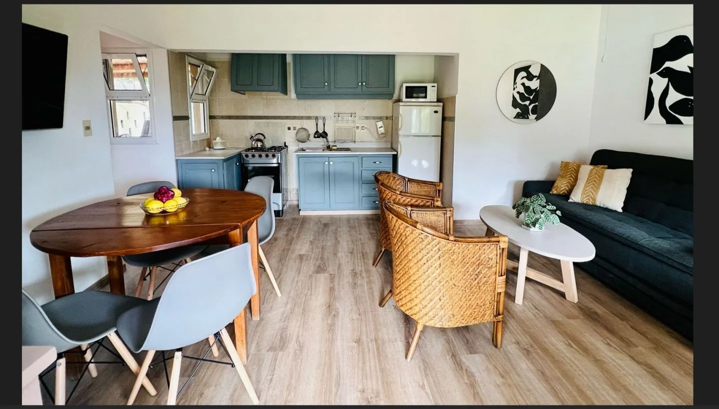 El dormitorio tiene 1 cama matrimonial, 1 aire acondicionado, 2 mesas de luz y placar. El living-comedor tiene: 2 sillones, 1 mesa ratona, 1 televisor, 1 mesa con 4 sillas, 1 alacena y 1 sillón-cama de 3 cuerpos. La cocina tiene heladera con freezer, cocina a gas, microondas, pequeños electrodomésticos y vajilla para 4 personas. Baño completo con calefón y lavarropas. Todas las ventanas de aluminio con rejas y puertas de maderas.