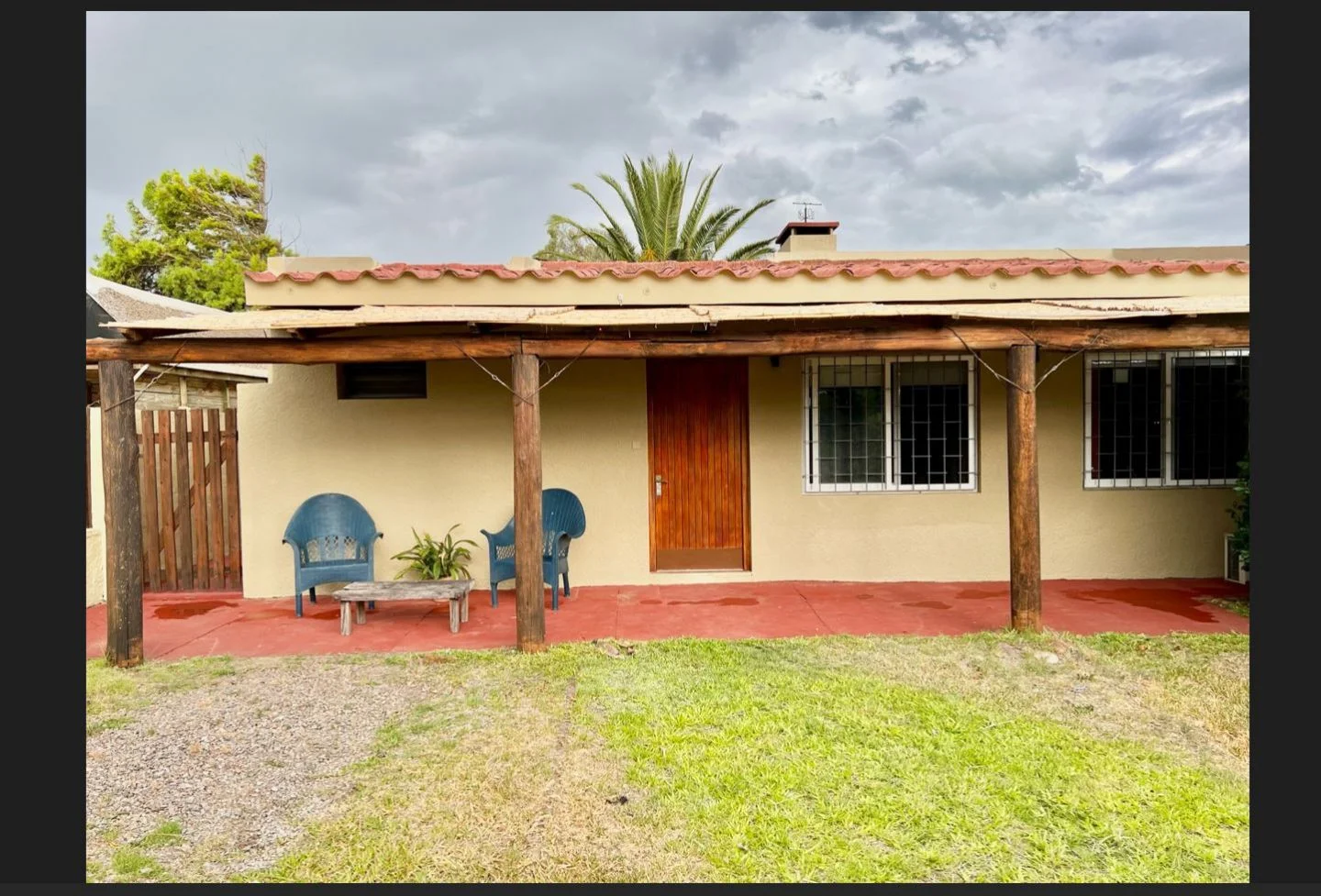 Al frente, con vista hacia la calle, galería techada con media-caña con 2 sillas de pvc y 1 mesa ratona.