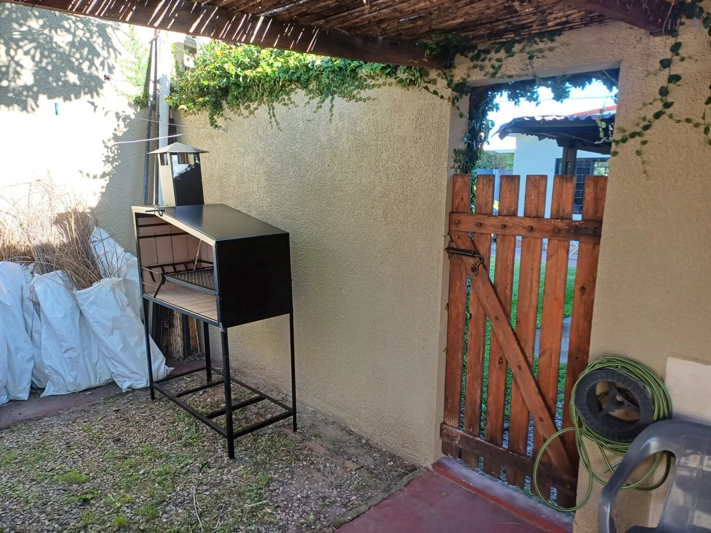 Al fondo, techado con media-caña: ½ tanque para parrilla, mesa con 4 sillas de pvc y algunos árboles.