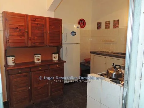 Cocina c/mesada en L, doble pileta inox, muebles bajo mesada, aparador de cocina, heladera con freezer, cocina a gas, garrafa 13 kg, microondas, vajilla completa, salida a garaje.