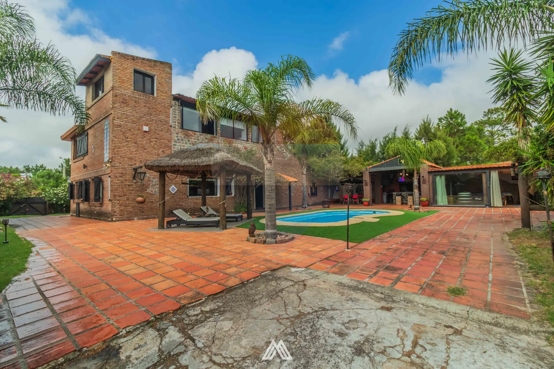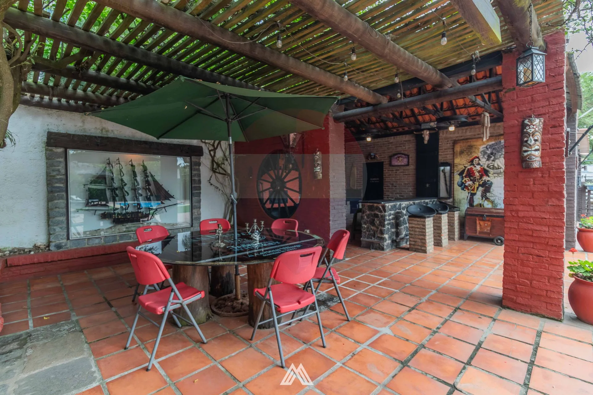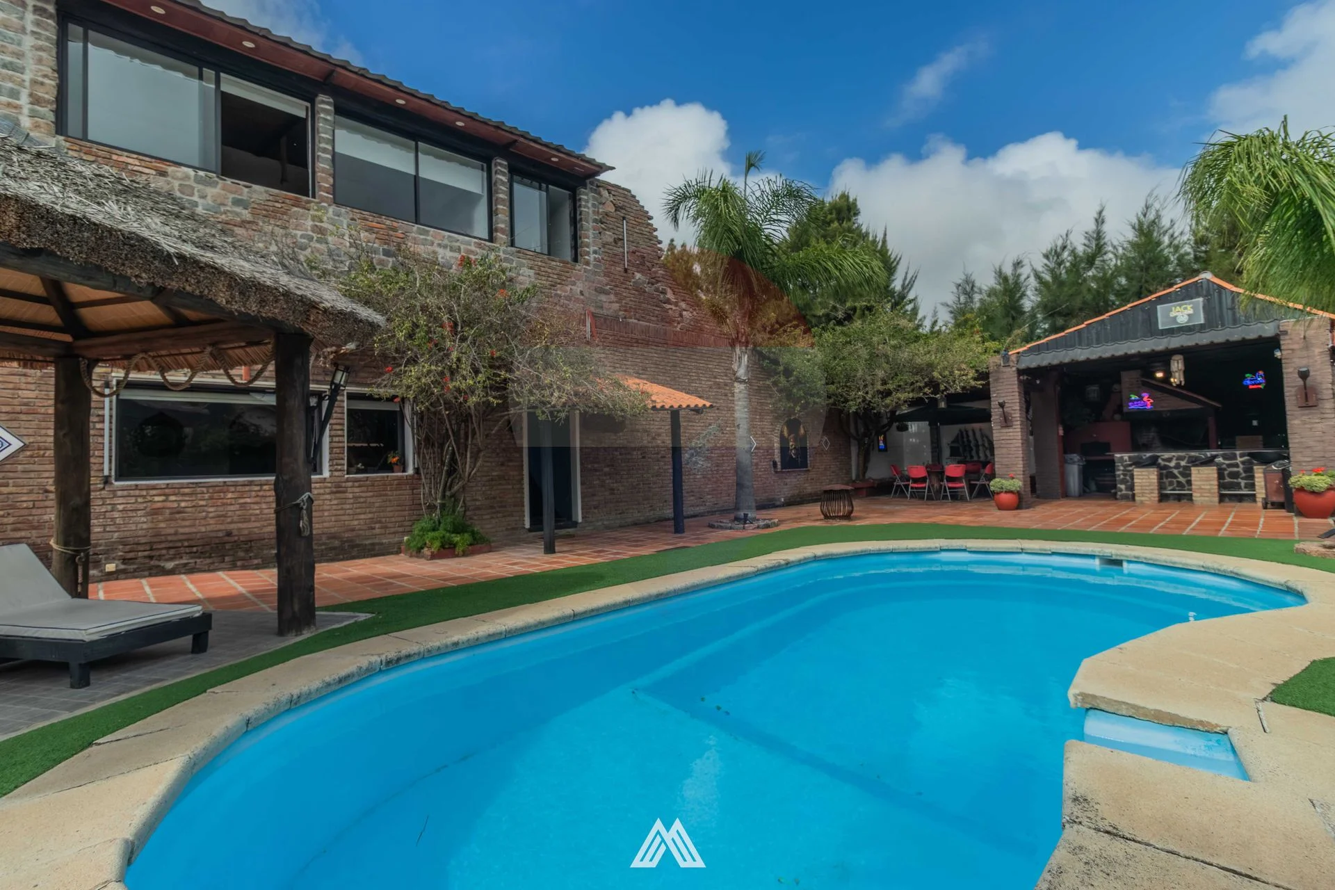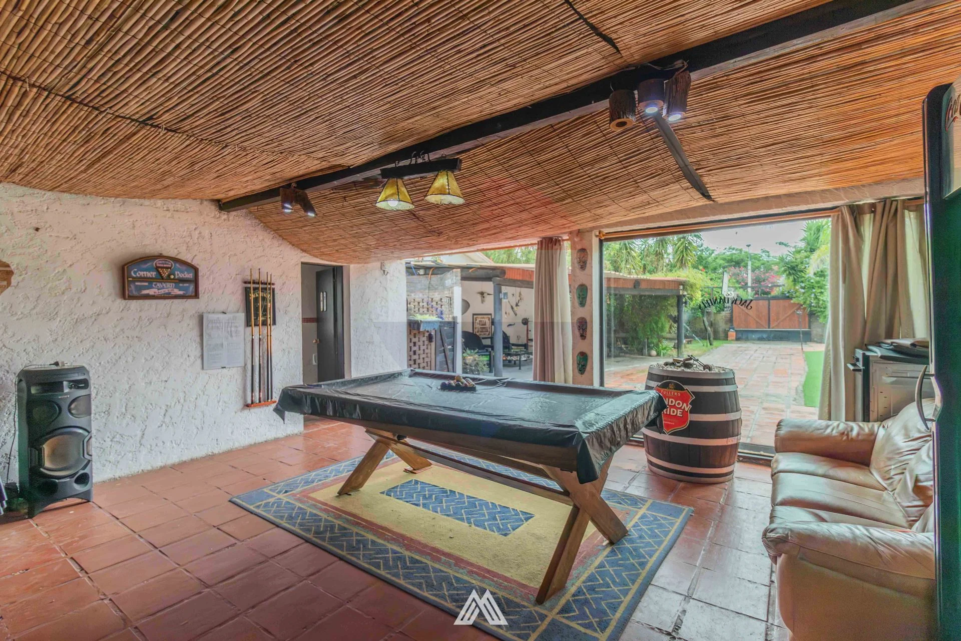 Barbacoa cerrada completa con baño y mesa de pool.