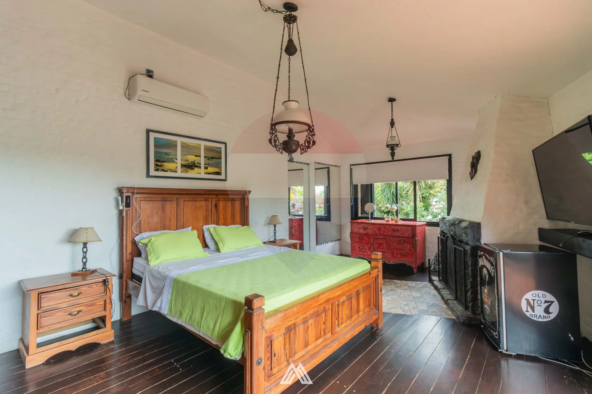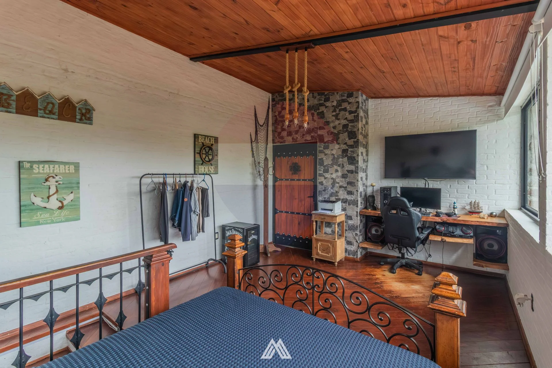 Dormitorio principal en suite con balcón hacia el mar. Estufa a leña.