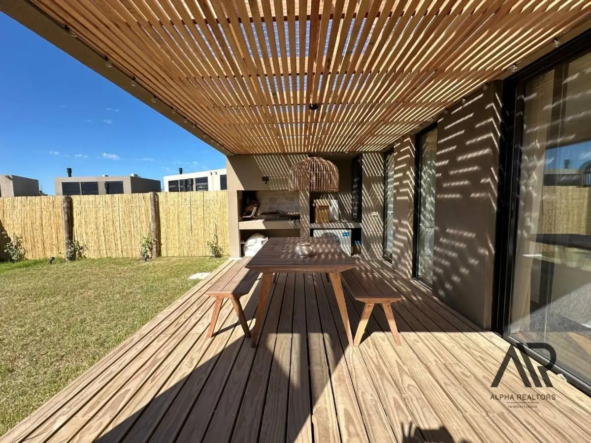 - Área exterior de deck y pérgola en madera natural (no incluye entablillado y chapa)
