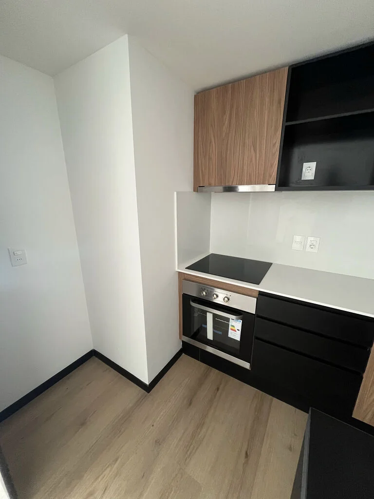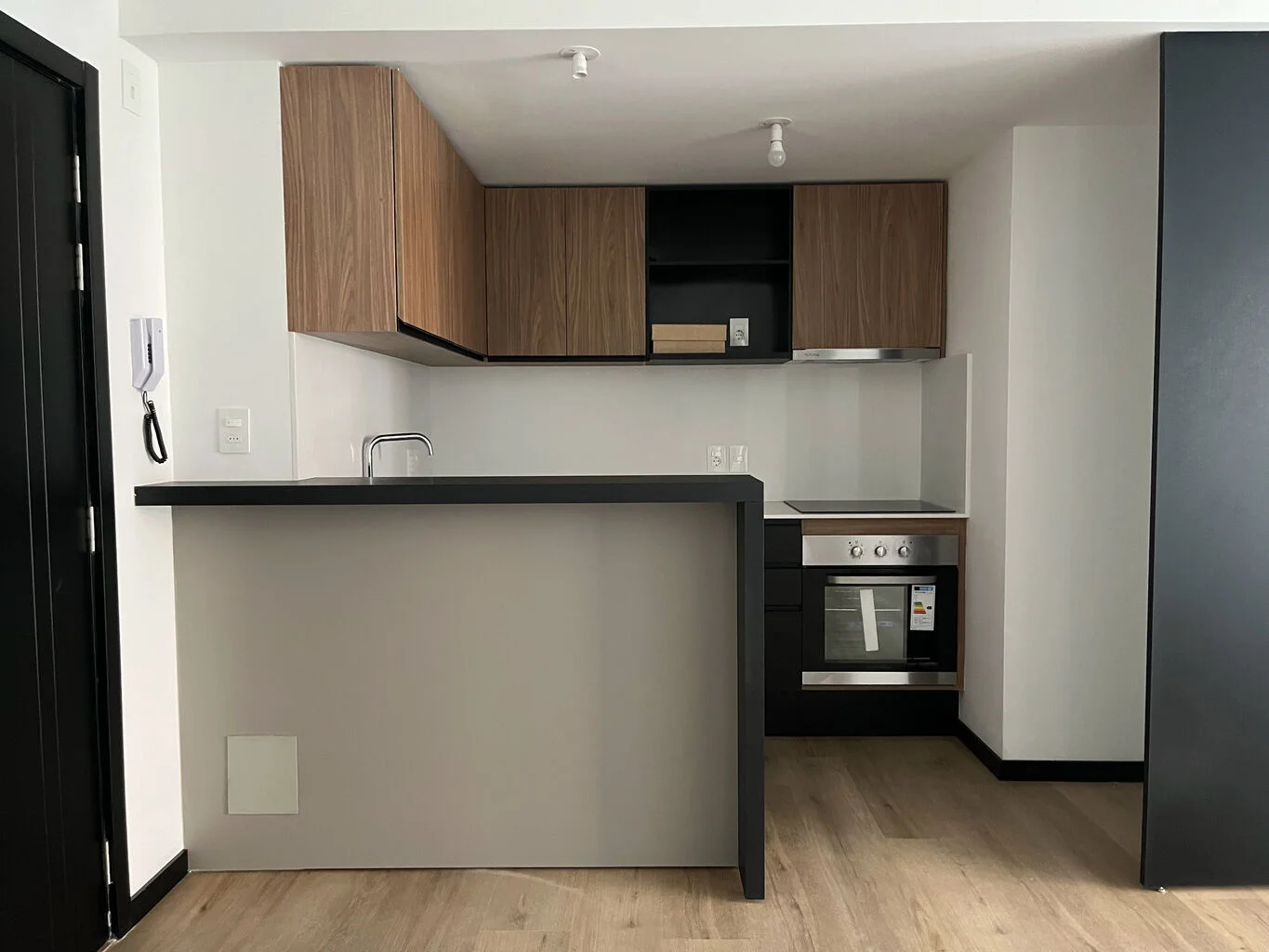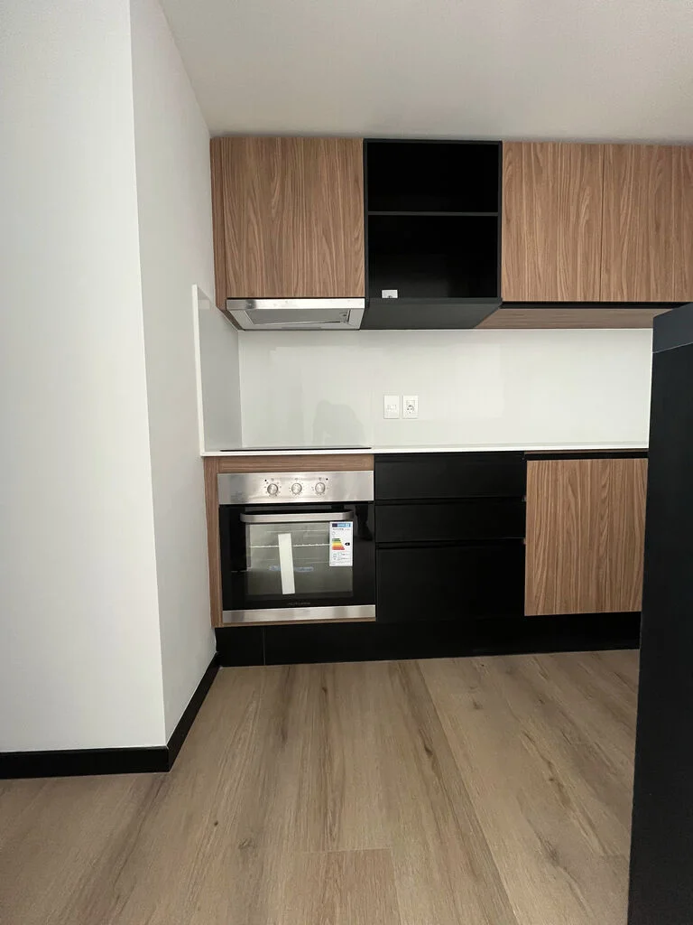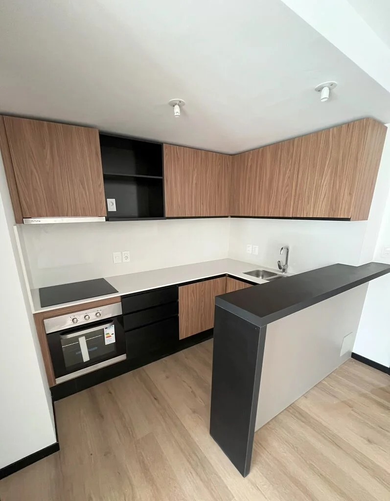 Cocina definida, con muebles bajo y sobre mesada, equipada con horno empotrado, anafe y campana extractora