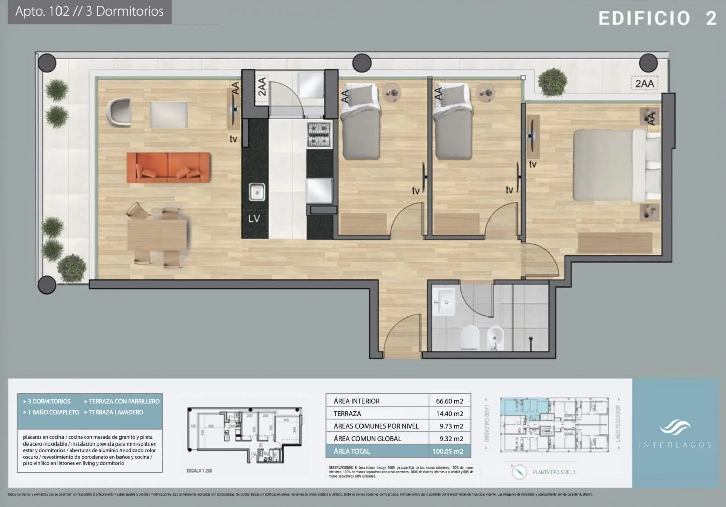 Living comedor con enormes ventanales generando alusión a un barco con vista hacia el lago. Salida a terraza. Cocina semi-integrada con salida a terraza lavadero. 3 Dormitorios, uno de ellos con salida a terraza. 1 baño completo. Excelentes terminaciones y amplios ambientes. Dos dormitorios con placares.