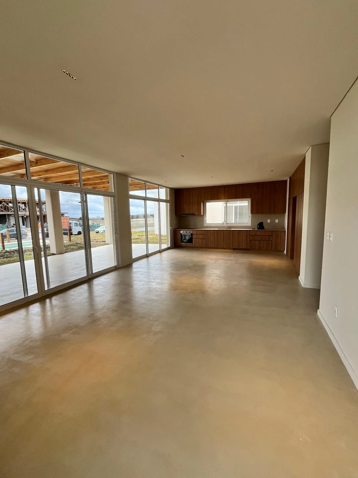 Living comedor y cocina todo integrado en un gran espacio, estufa a leña y ventanales hacia el jardin
