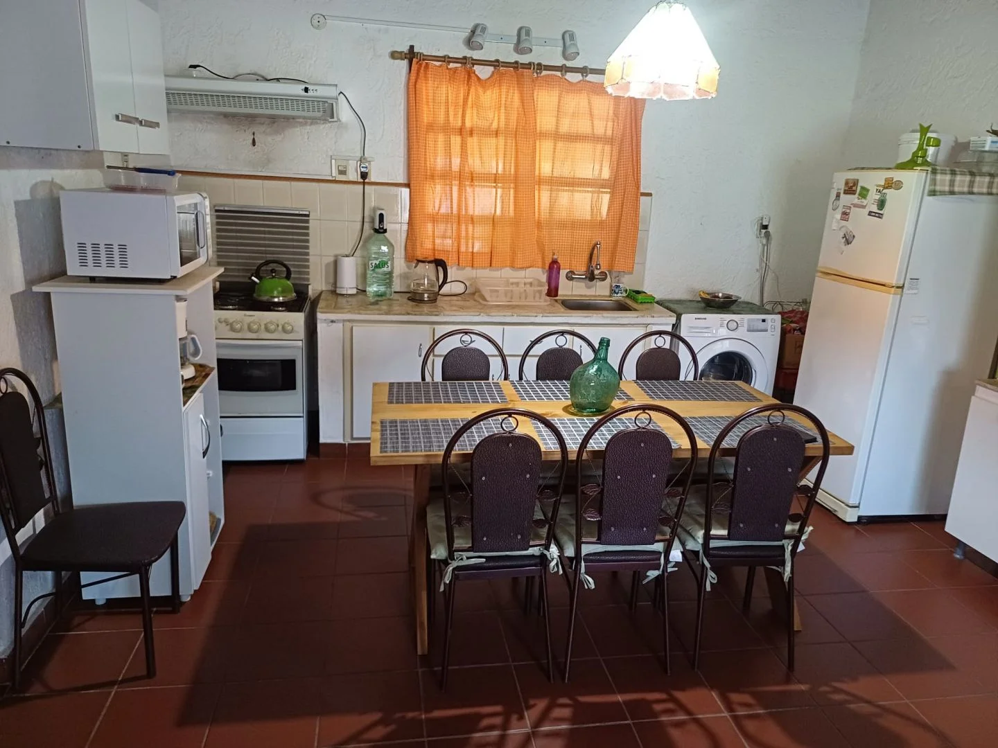 - Living comedor con cocina integrada: TV color, PC, heladera con freezer, microondas, cocina a gas, campana c/purificador de aire, vajilla completa.