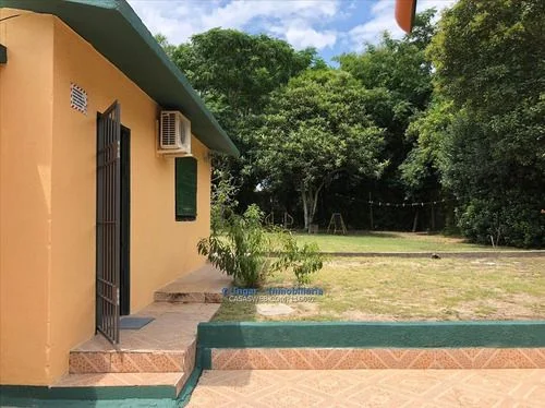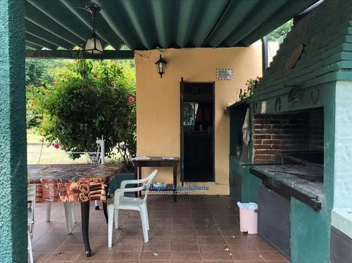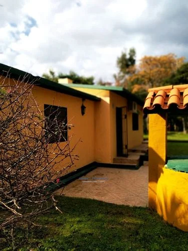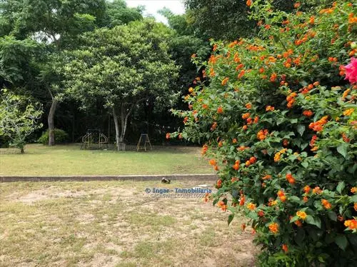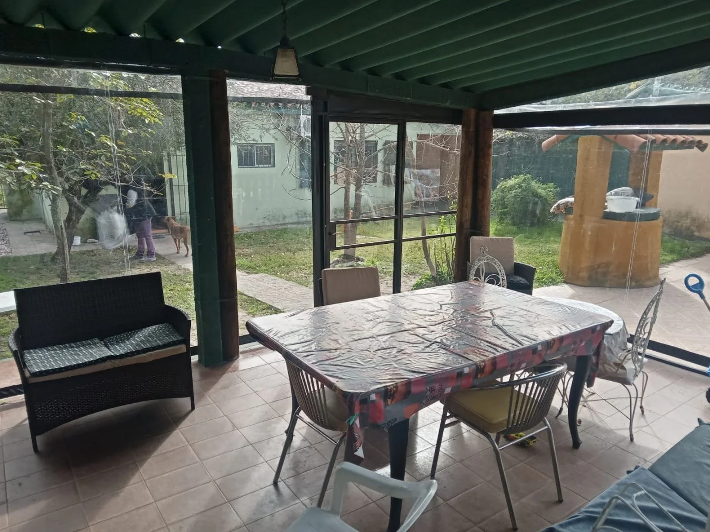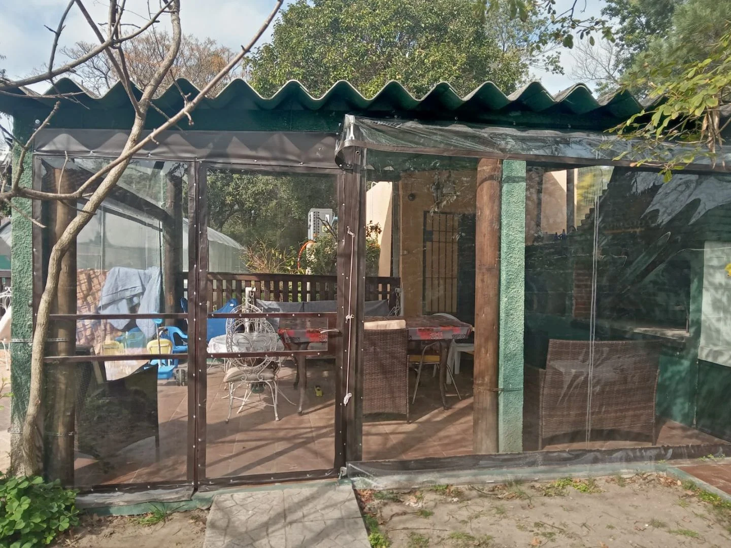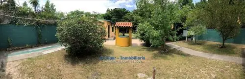 Cochera techada para 2 autos pero pueden entrar 2 más en el terreno cercado. Fondo con muchos árboles y juegos para niños.