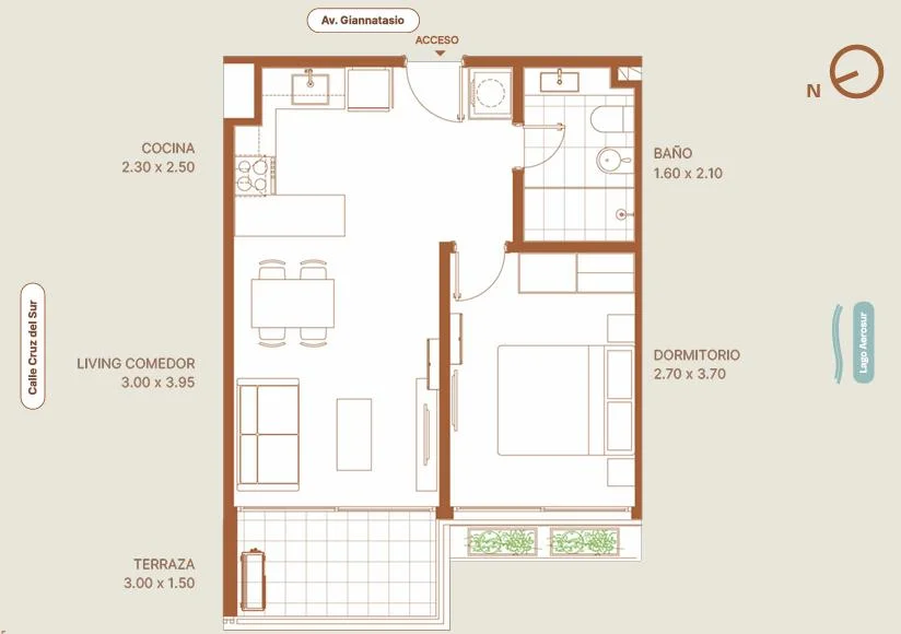 En los dormitorios se incluyen placares en melamínico, al igual que en la cocina, que dispone de muebles sobre y bajo mesada. Según la tipología, las unidades pueden presentar cocina integrada, semi integrada o definida, adaptándose a las distintas necesidades de cada estilo de vida.